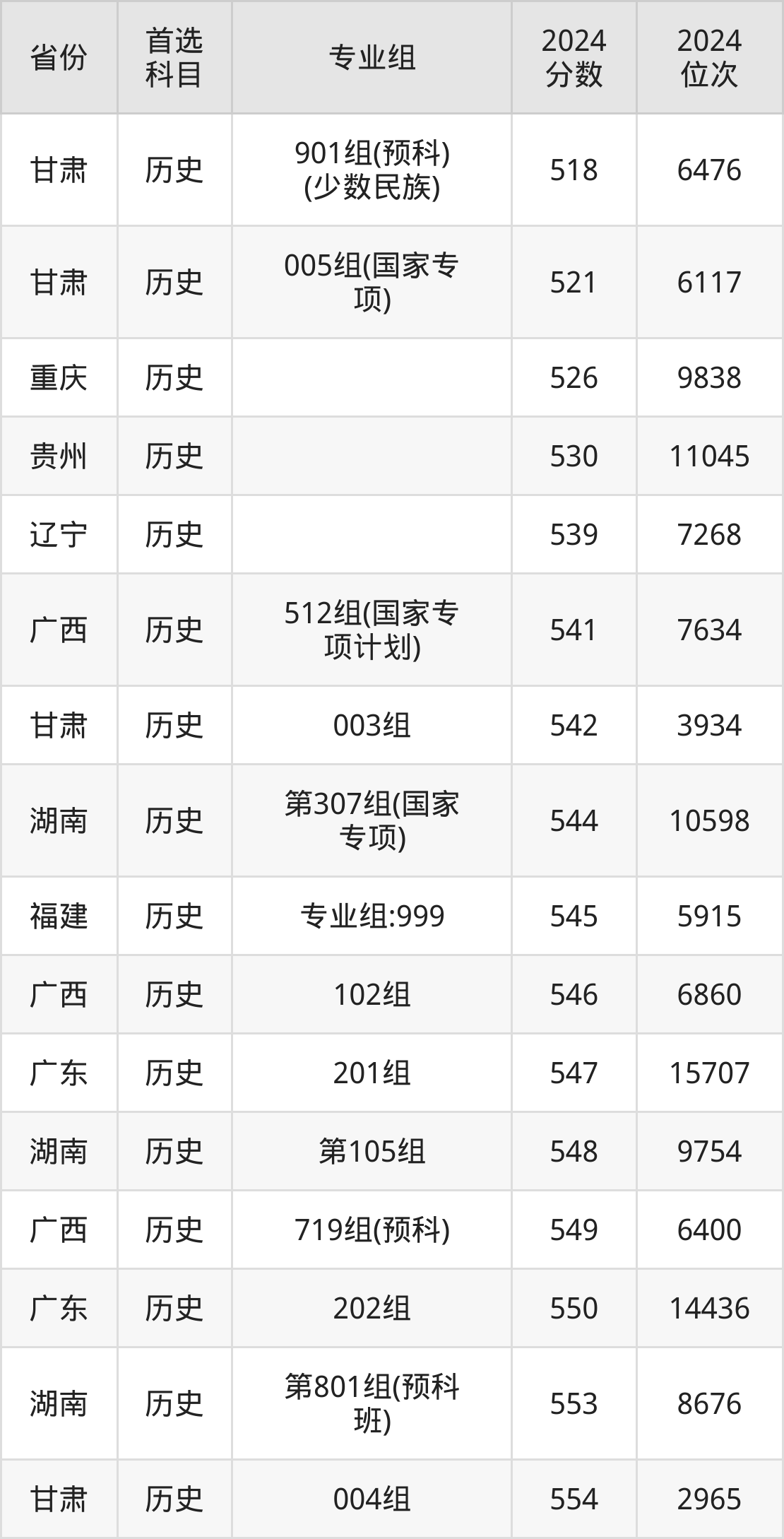 历史类:第02组555分、6994名,第03组561分、5878名,第04组(国家专项)561分、5878名,第05组553分、7378名,第06组561分、5878名;