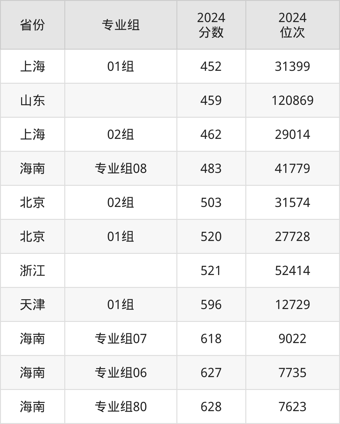 最低分对应地区为上海(01组),录取位次为31399,超本科线49分;最高分对应地区为海南(专业组80),录取位次为7623,超本科线145分。