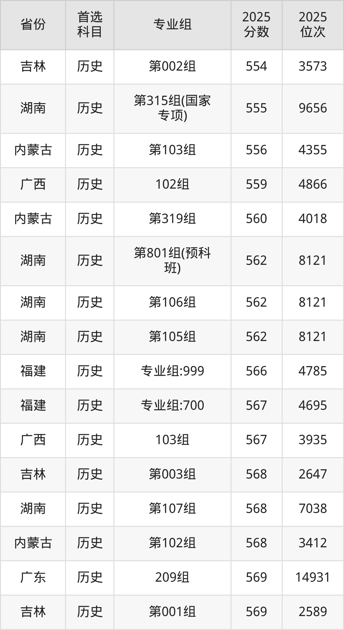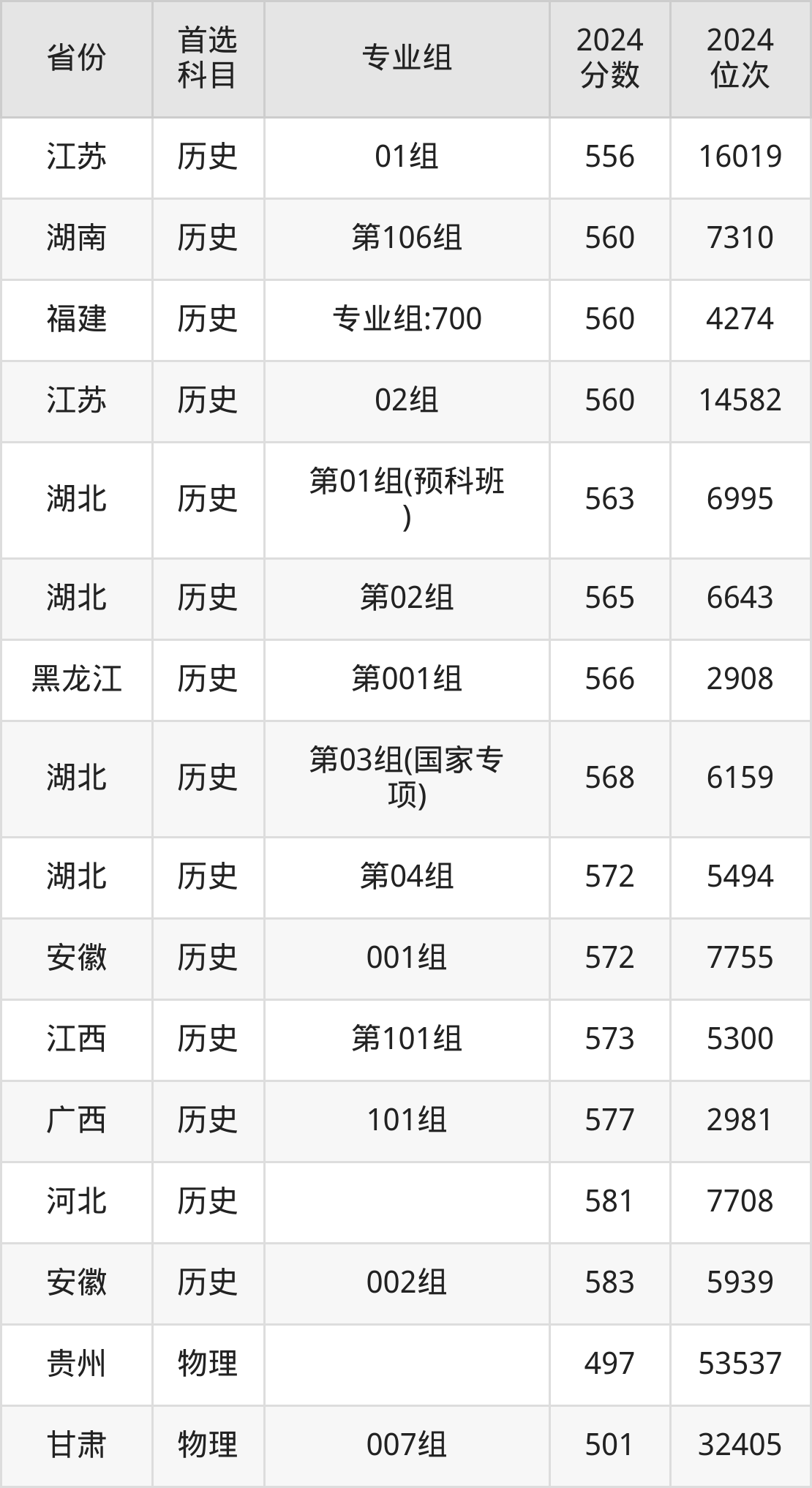 历史类:第01组562分、6727名,第02组565分、6258名,第03组(预科班)560分、7076名,第04组(国家专项)565分、6258名,第05组565分、6258名;