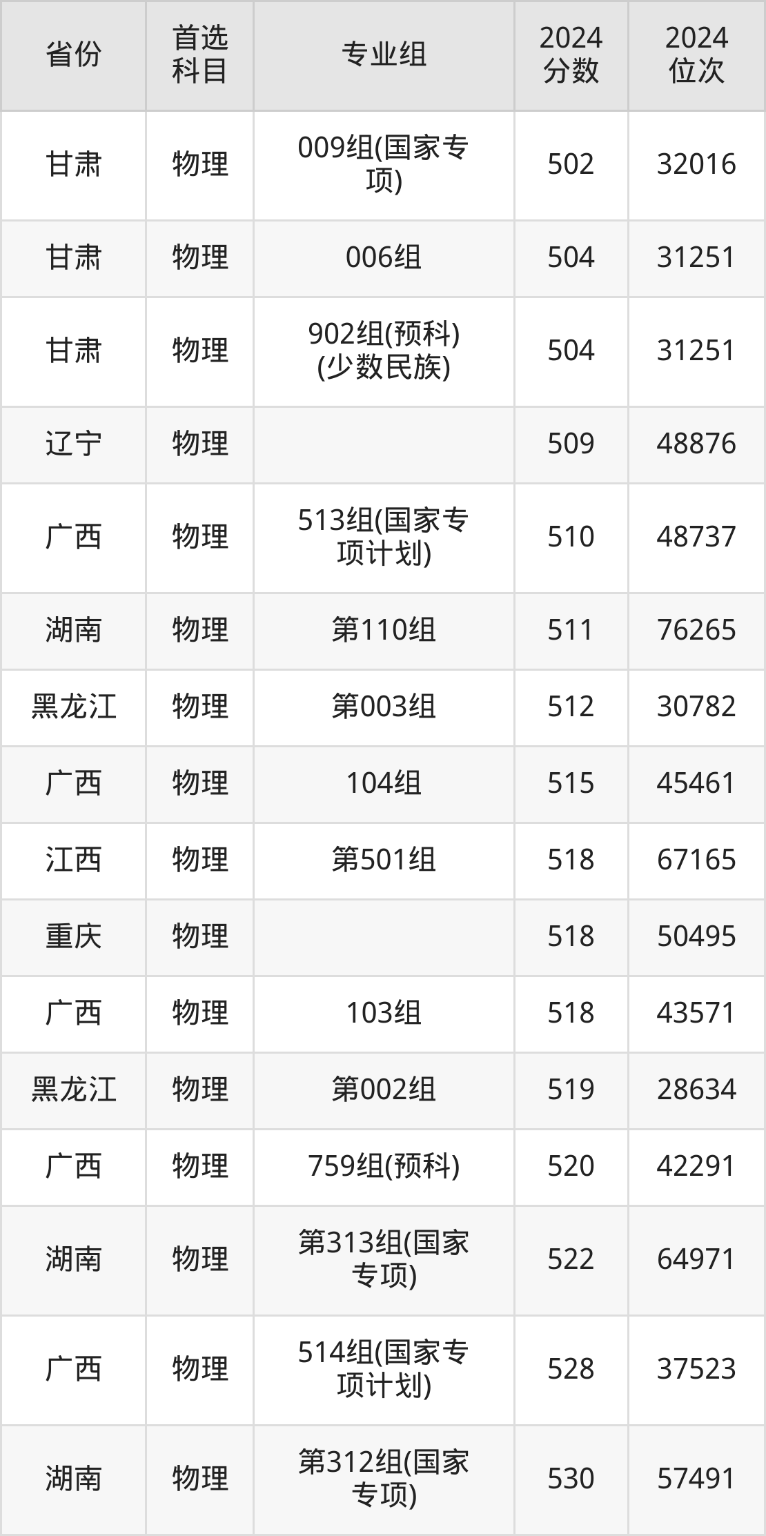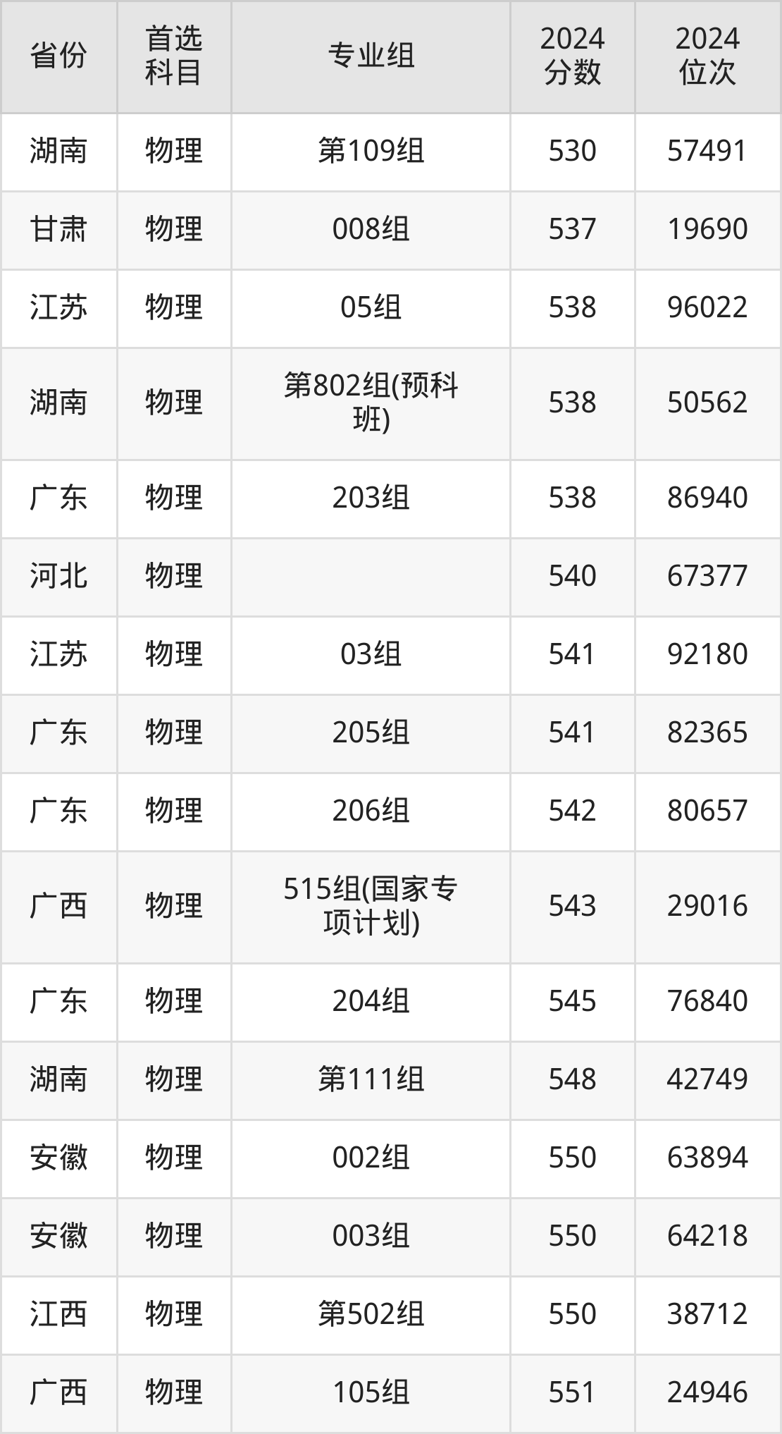 物理类:第08组533分、40184名,第09组547分、31412名,第10组(国家专项)547分、31412名,第11组525分、45487名,第12组542分、34452名,第13组(国家专项)537分、37555名,第14组528分、43469名,第15组543分、33823名。