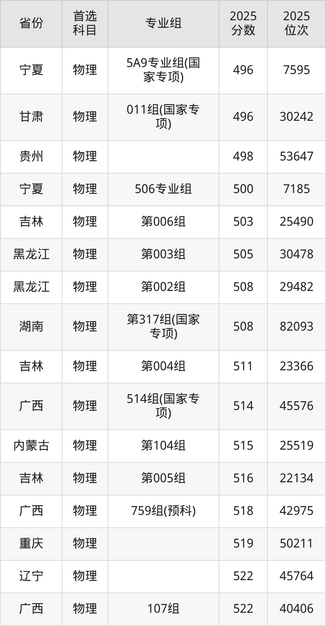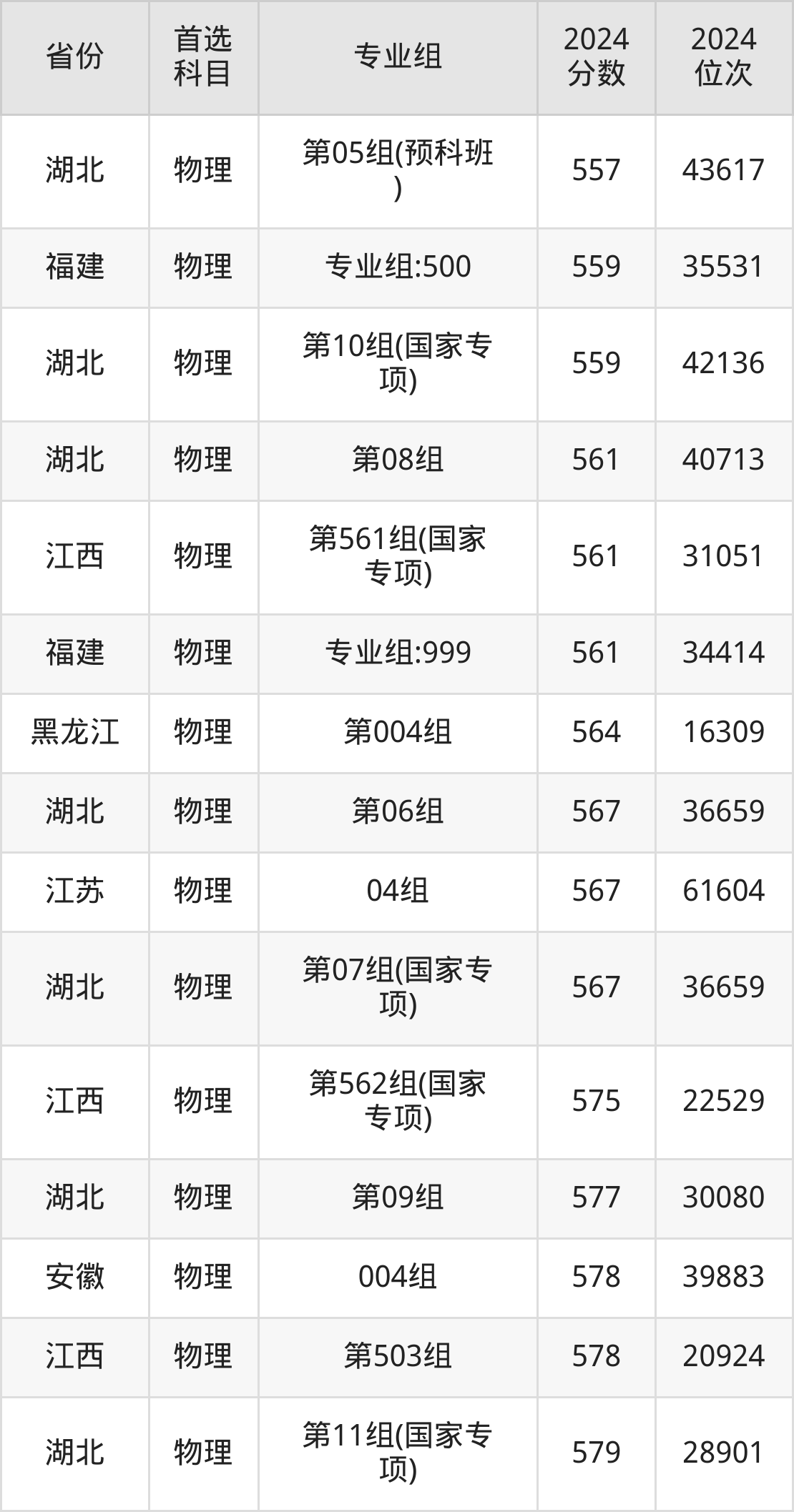 物理类:第05组(预科班)557分、43617名,第06组567分、36659名,第07组(国家专项)567分、36659名,第08组561分、40713名,第09组577分、30080名,第10组(国家专项)559分、42136名,第11组(国家专项)579分、28901名;