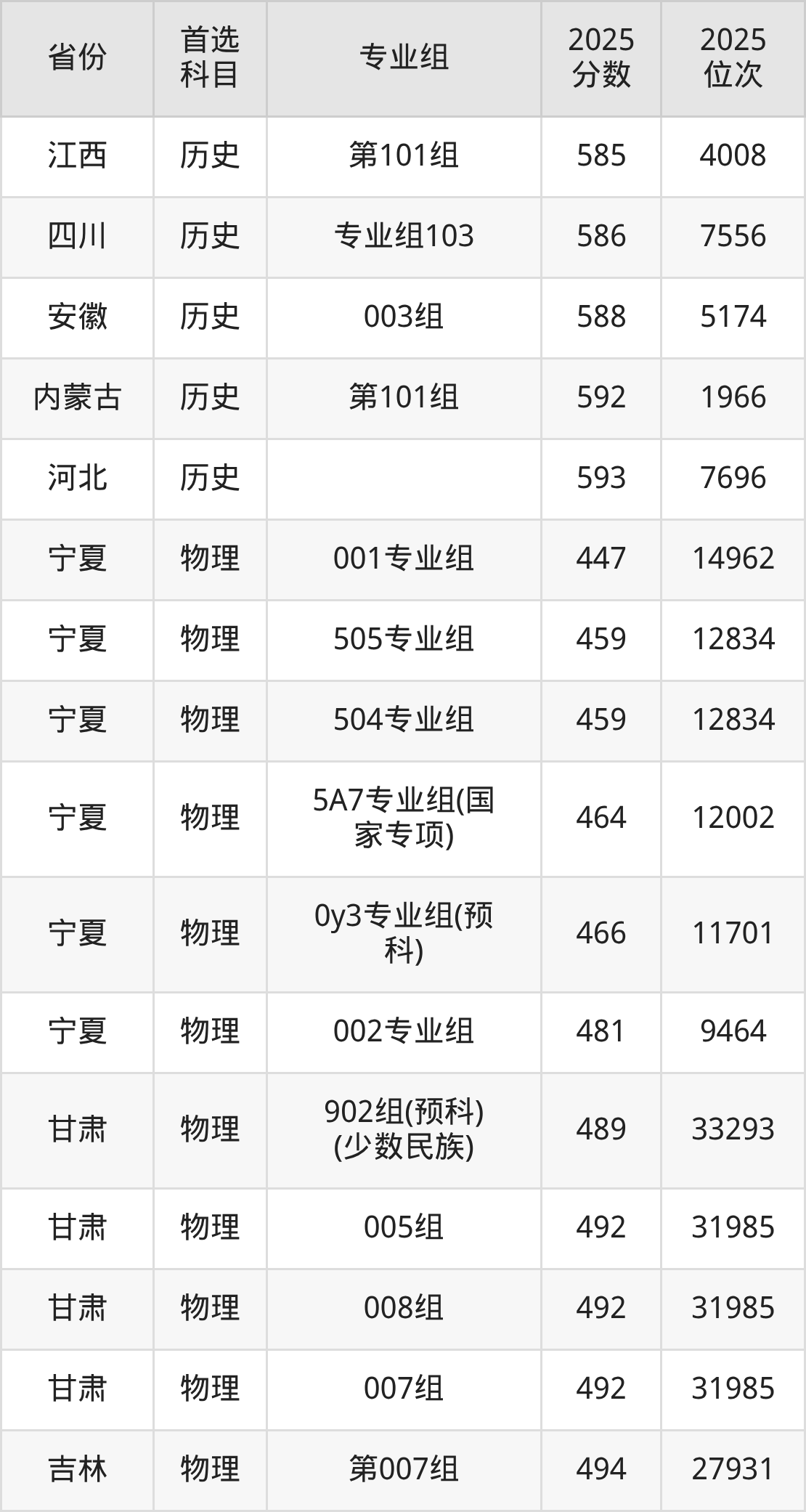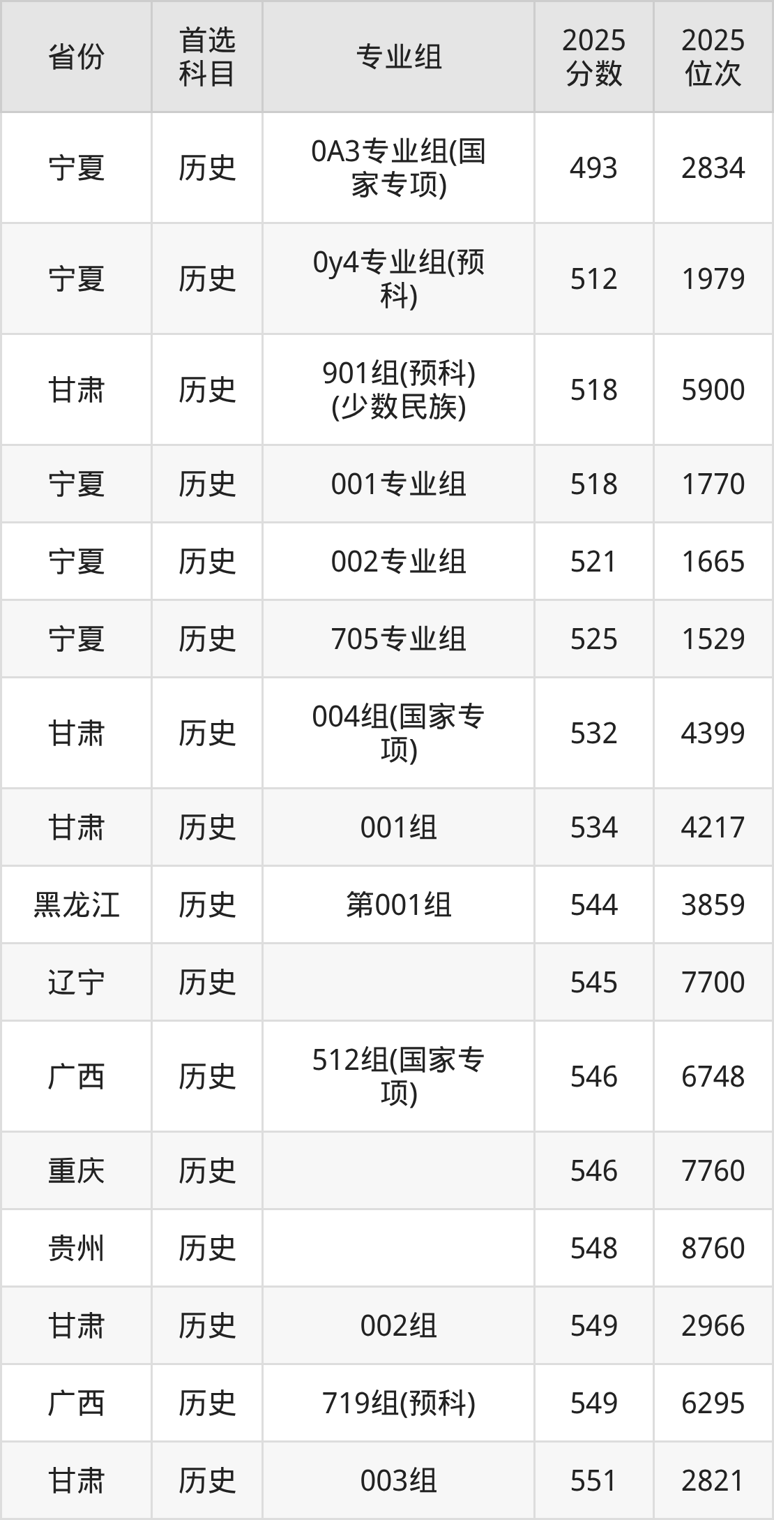 历史类:第01组(预科班)563分、6995名,第02组565分、6643名,第03组(国家专项)568分、6159名,第04组572分、5494名;