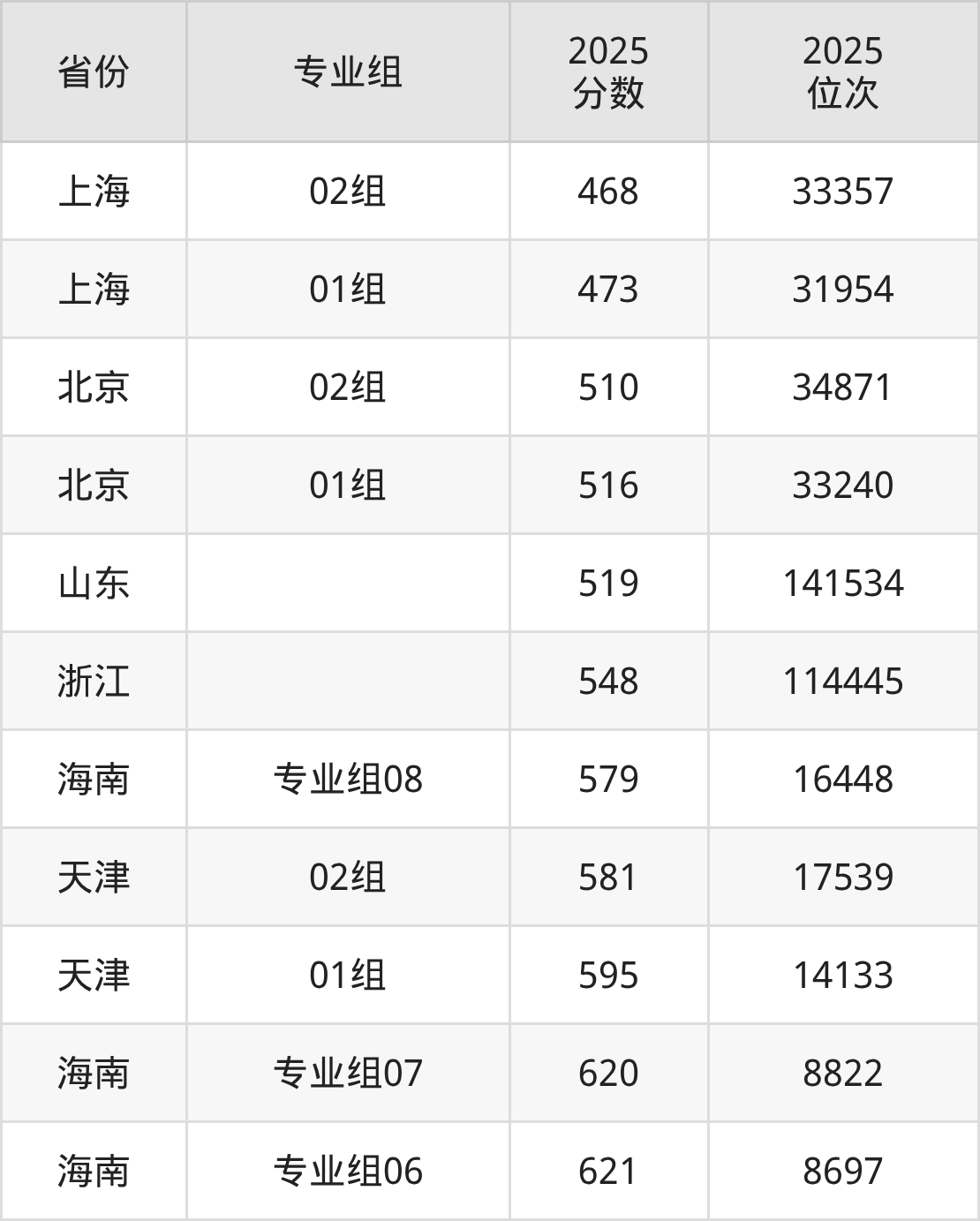 最低分对应地区为上海(02组),录取位次为33357,超本科线66分;最高分对应地区为海南(专业组06),录取位次为8697,超本科线141分。