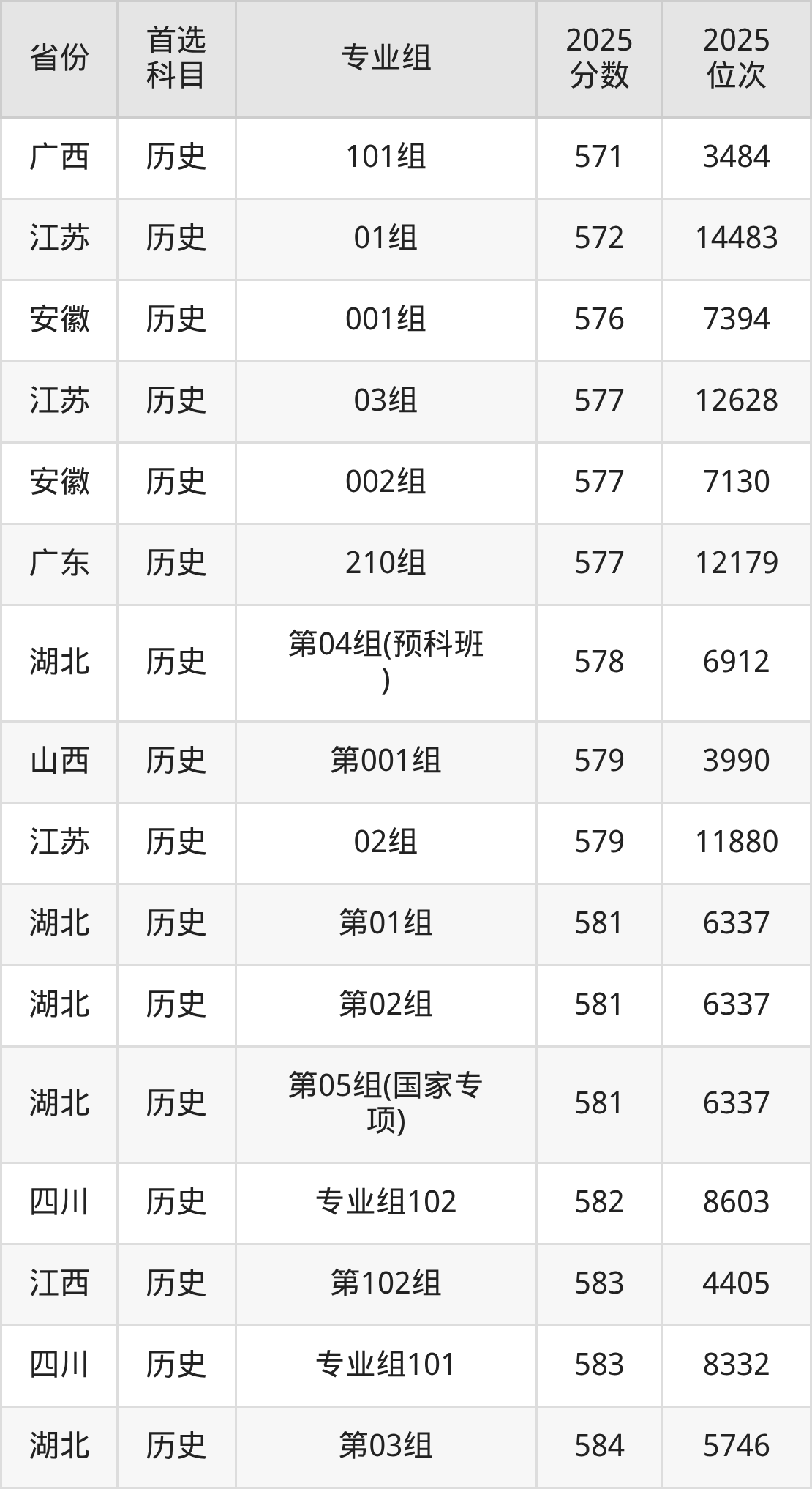 历史类:第01组581分、6337名,第02组581分、6337名,第03组584分、5746名,第04组(预科班)578分、6912名,第05组(国家专项)581分、6337名;