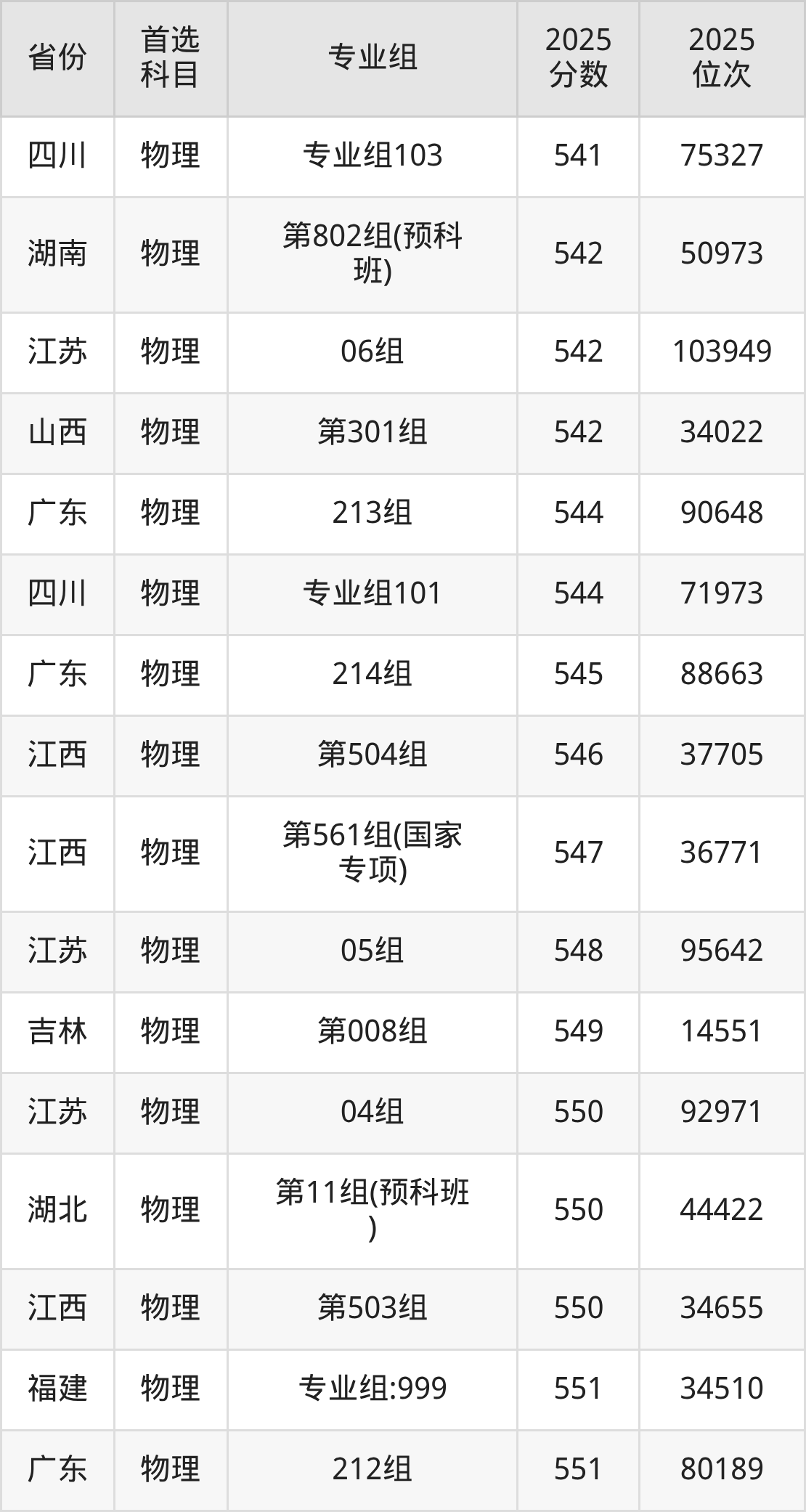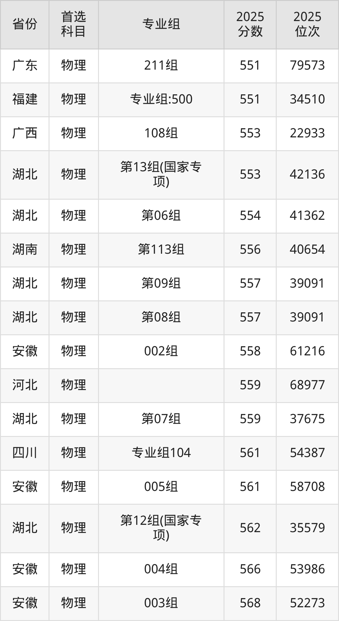 物理类:第06组554分、41362名,第07组559分、37675名,第08组557分、39091名,第09组557分、39091名,第10组573分、28352名,第11组(预科班)550分、44422名,第12组(国家专项)562分、35579名,第13组(国家专项)553分、42136名,第14组(国家专项)574分、27750名;