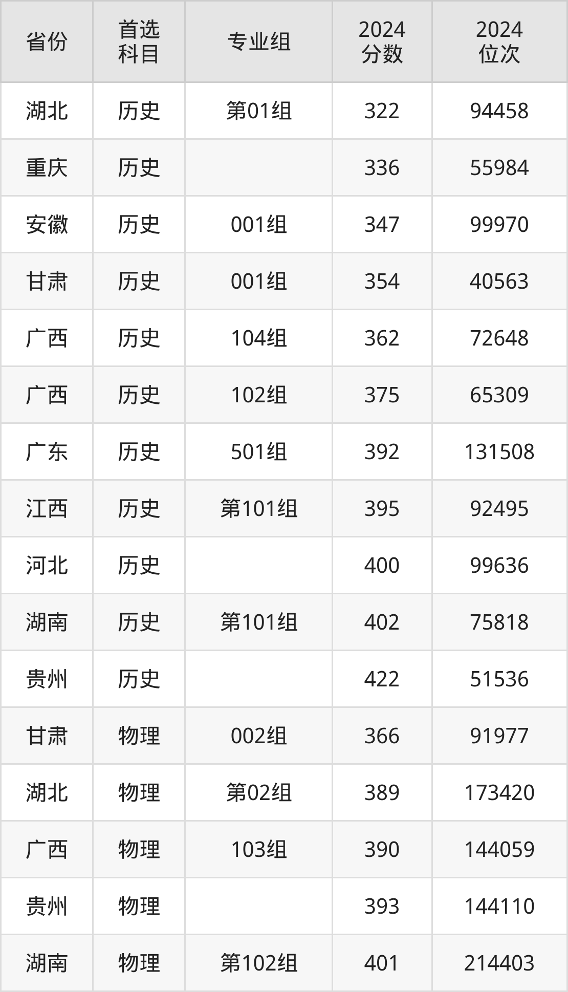 历史类最低分对应地区为湖北(第01组),录取位次为94458,超专科线122分;最高分对应地区为贵州,录取位次为51536,超专科线242分。