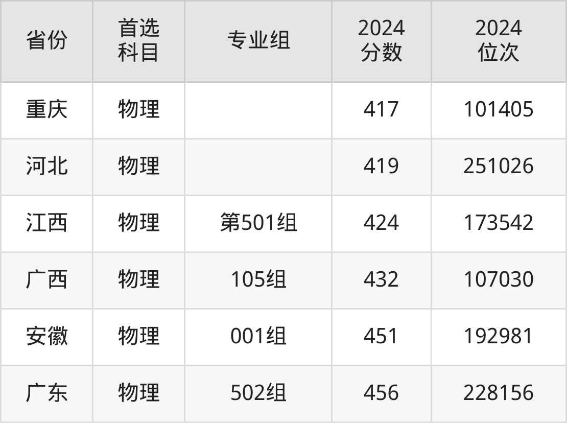 物理类最低分对应地区为甘肃(002组),录取位次为91977,超专科线206分;最高分对应地区为广东(502组),录取位次为228156,超专科线256分。