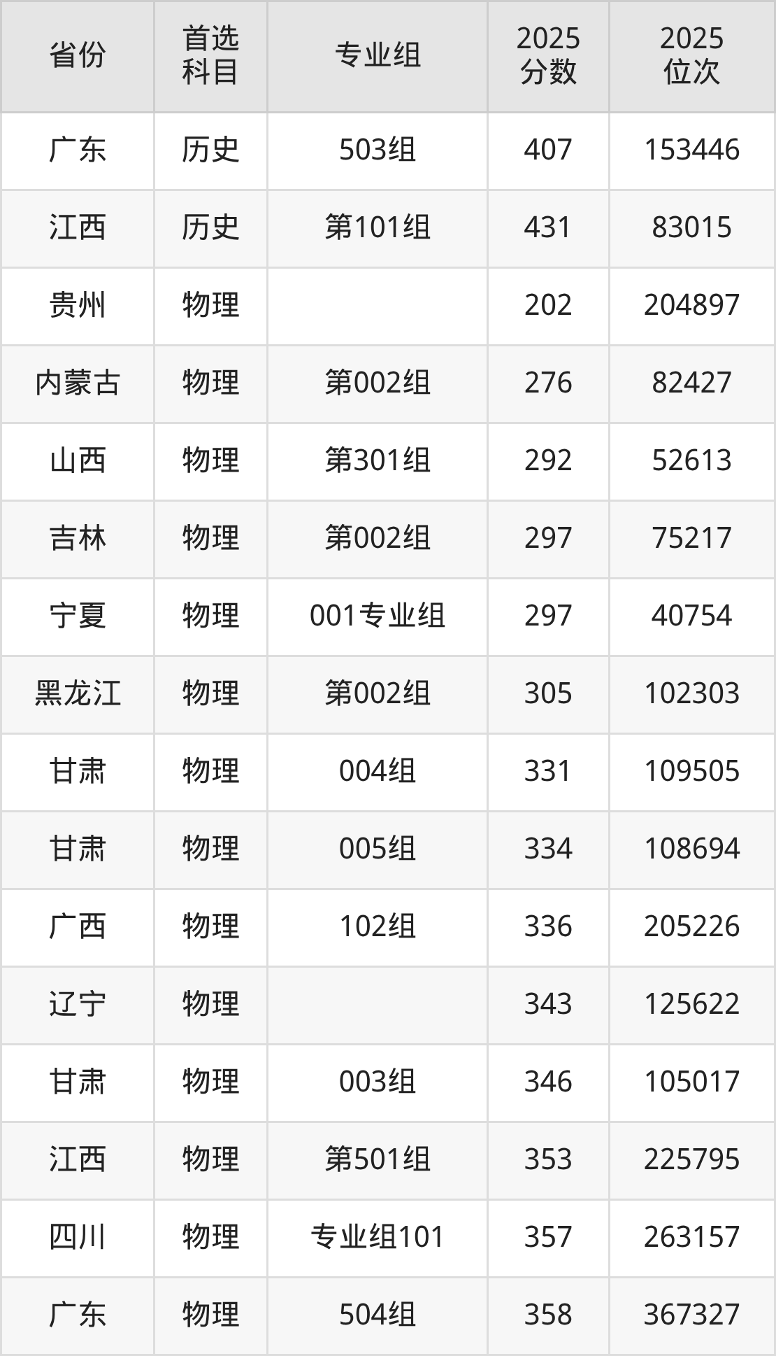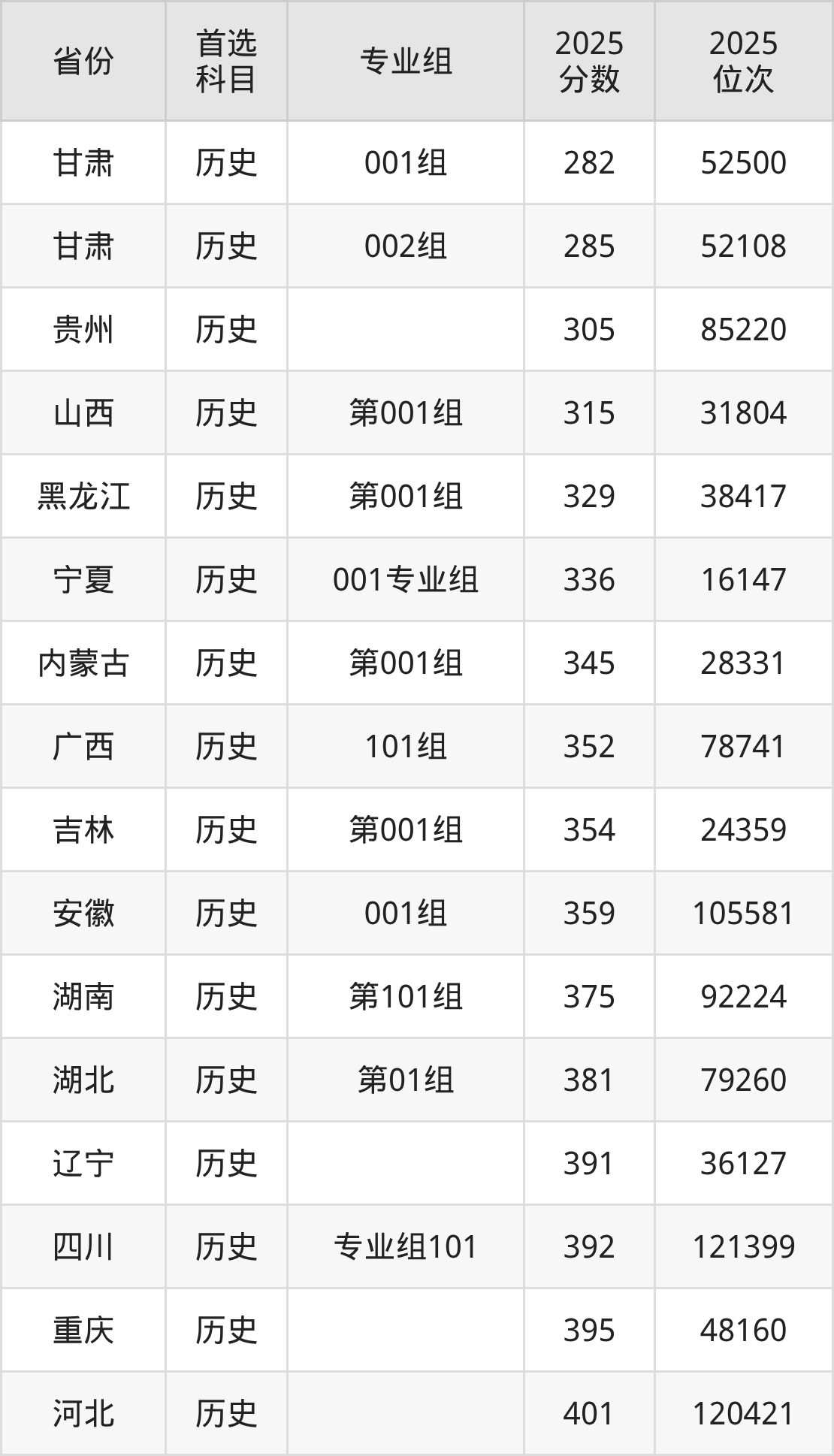 历史类最低分对应地区为甘肃(001组),录取位次为52500,超专科线122分;最高分对应地区为江西(第101组),录取位次为83015,超专科线141分。