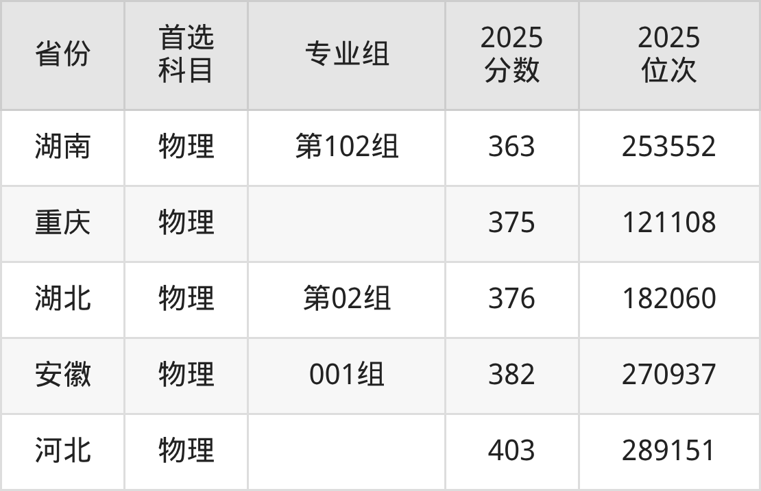 物理类最低分对应地区为贵州,录取位次为204897,超专科线22分;最高分对应地区为河北,录取位次为289151,超专科线203分。