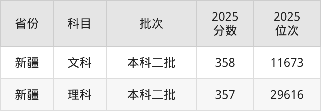 文科最低分对应地区为新疆,录取位次为11673,超二本线28分。