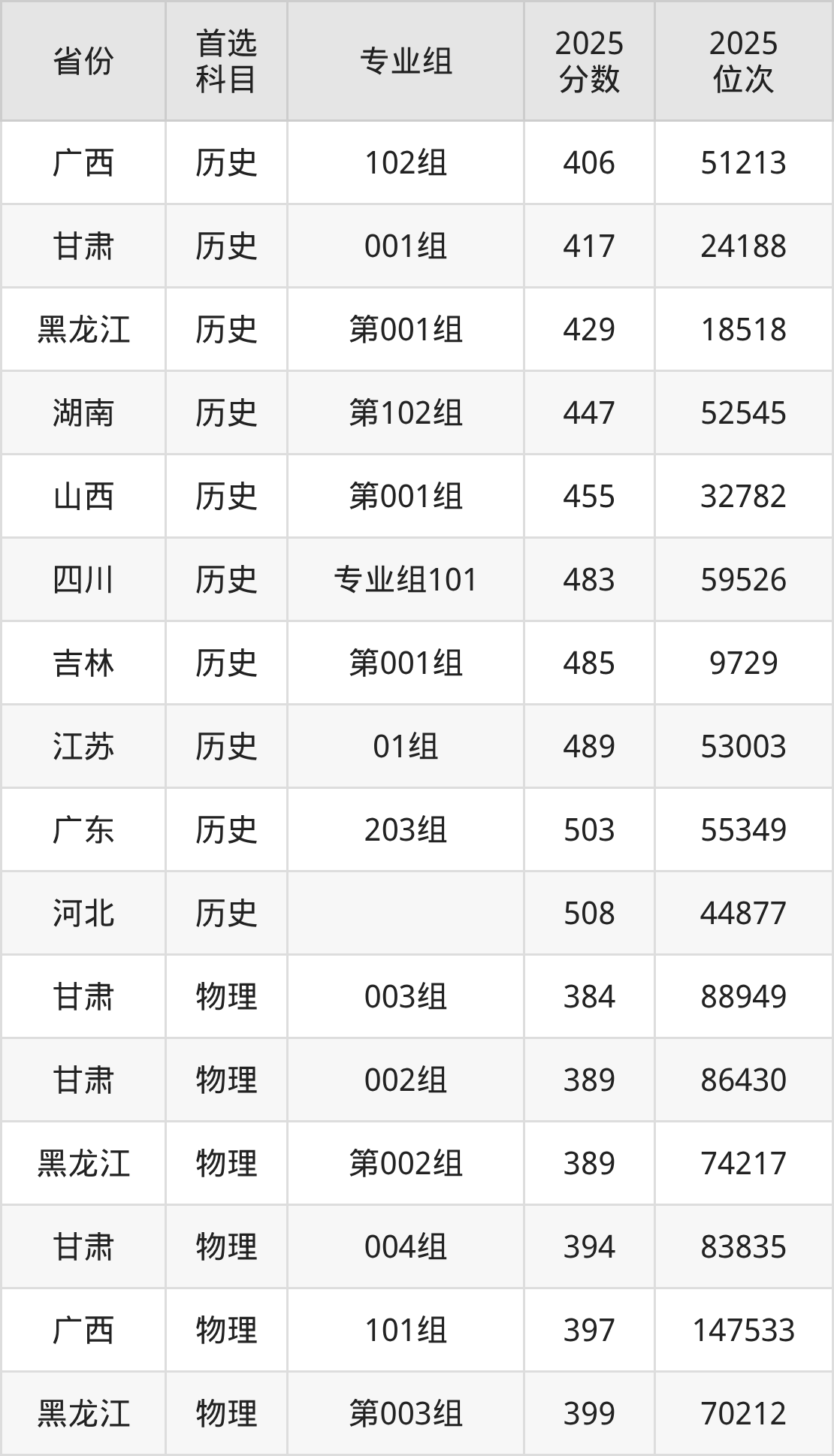 历史类最低分对应地区为广西(102组),录取位次为51213,超本科线4分;最高分对应地区为河北,录取位次为44877,超本科线31分。