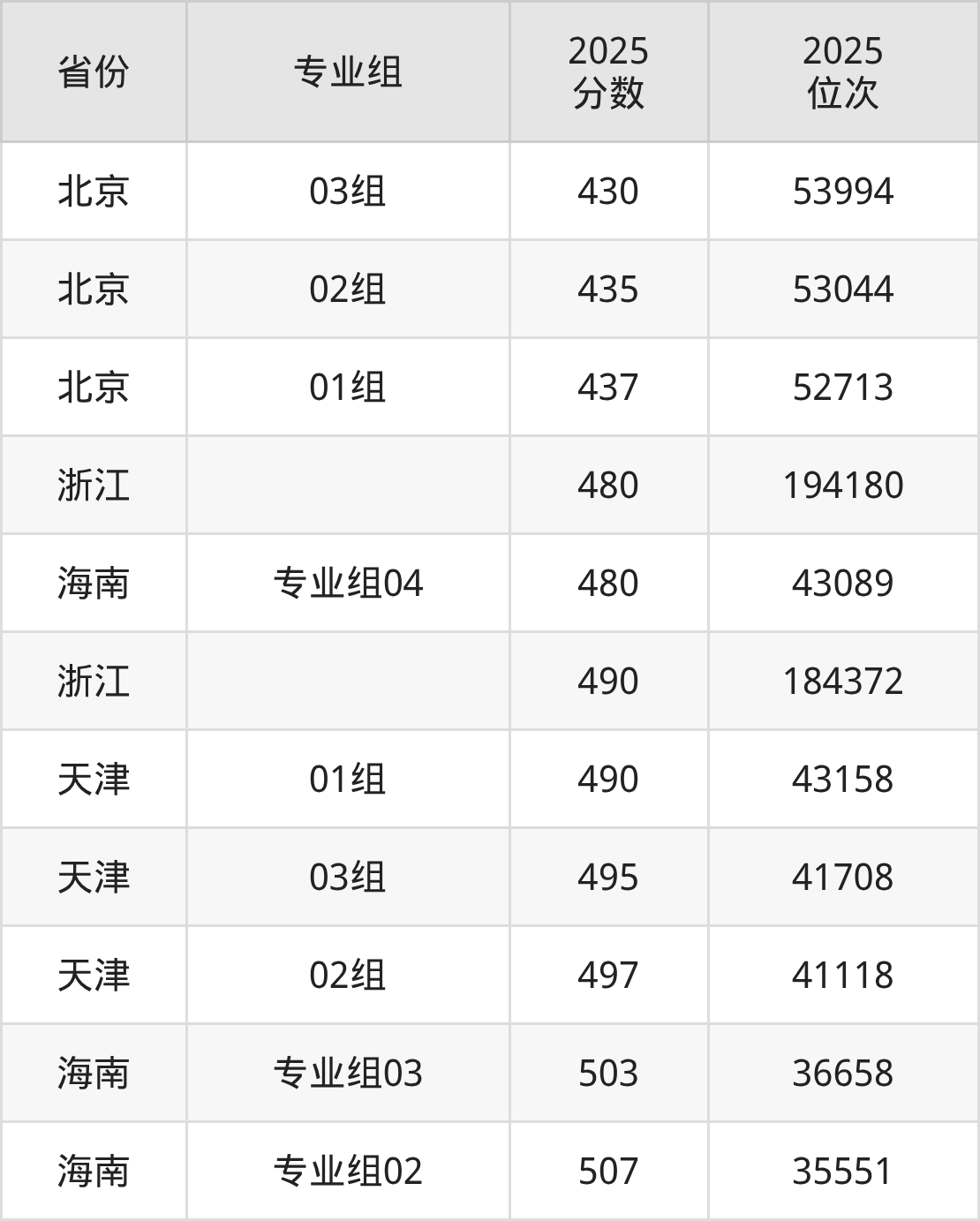 最低分对应地区为北京(03组),录取位次为53994;最高分对应地区为海南(专业组02),录取位次为35551,超本科线27分。