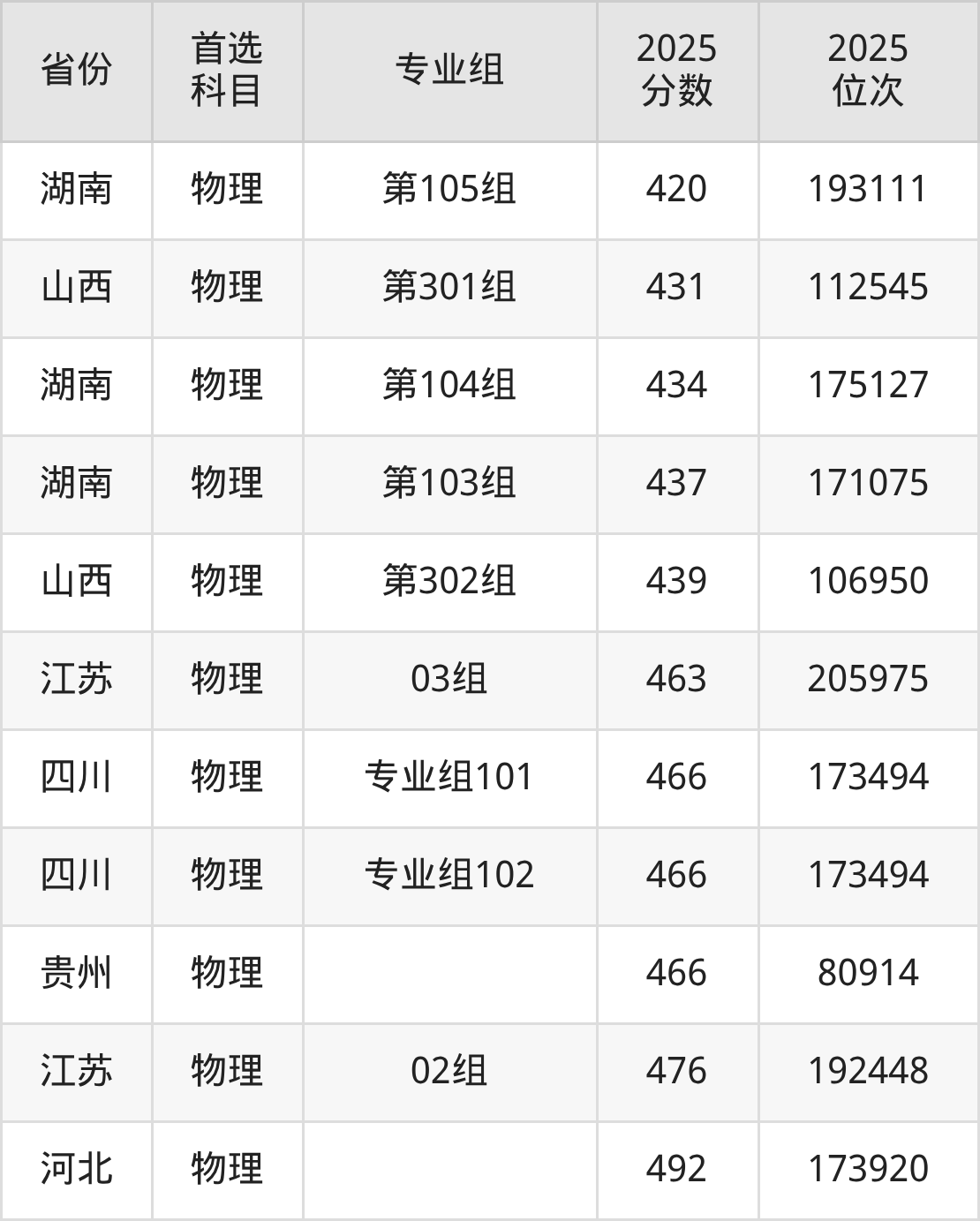 物理类最低分对应地区为甘肃(003组),录取位次为88949;最高分对应地区为河北,录取位次为173920,超本科线33分。
