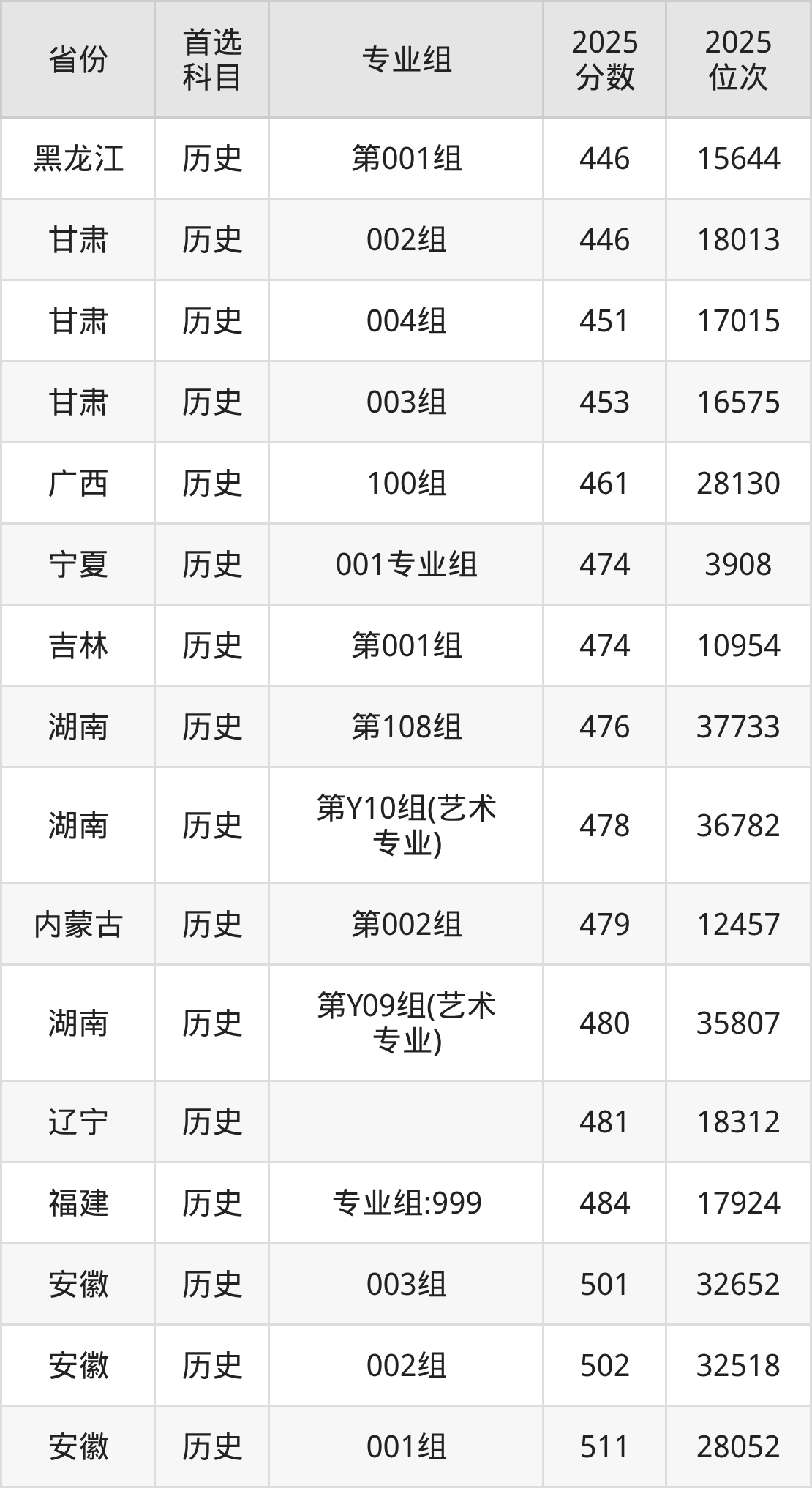 历史类:第108组476分、37733名,第Y09组(艺术专业)480分、35807名,第Y10组(艺术专业)478分、36782名;