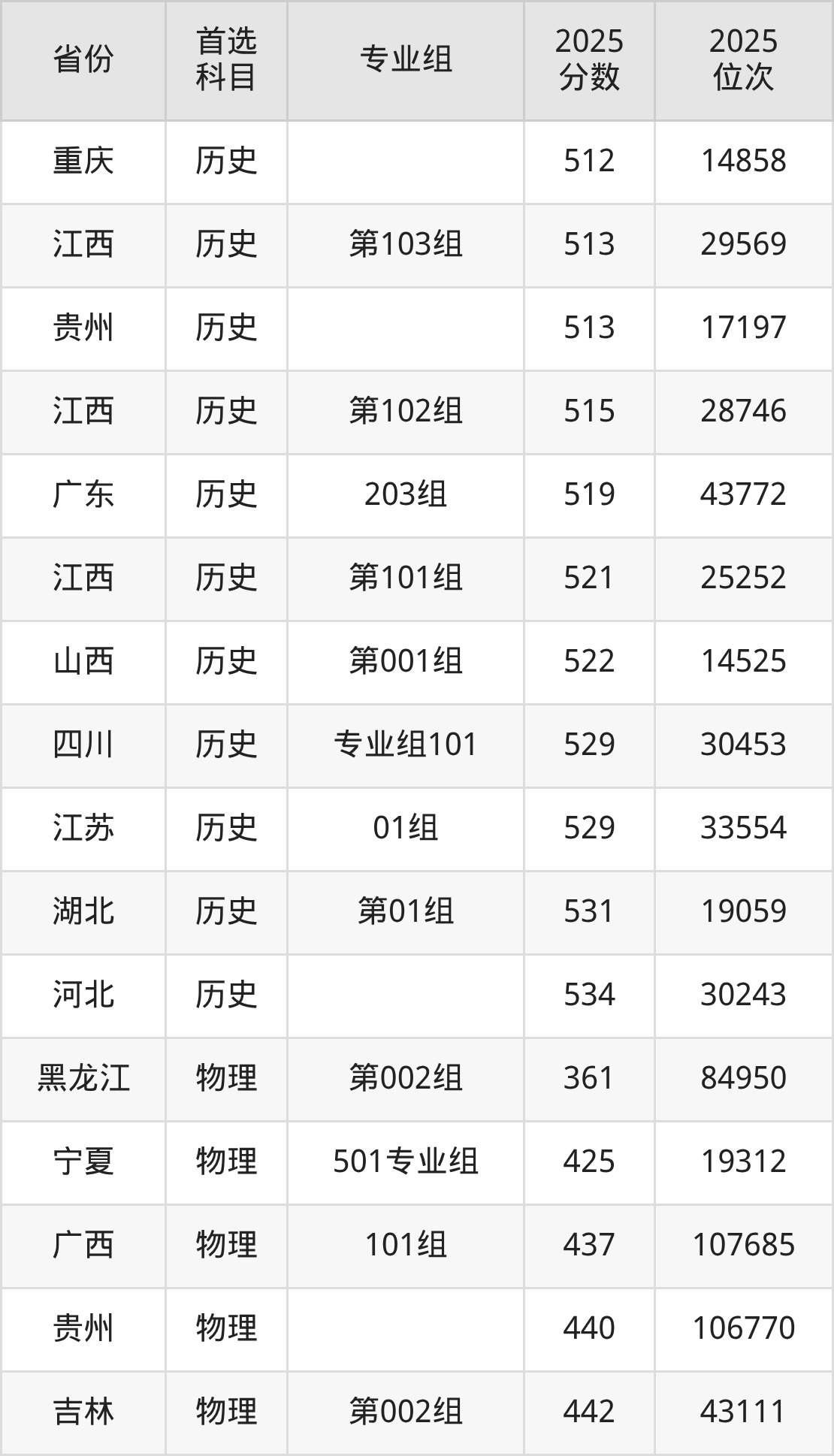 历史类最低分对应地区为黑龙江(第001组),录取位次为15644,超本科线41分;最高分对应地区为河北,录取位次为30243,超本科线57分。