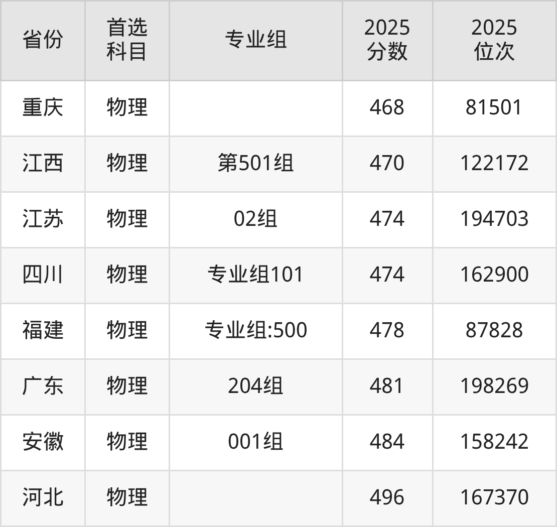 物理类最低分对应地区为黑龙江(第002组),录取位次为70605,超本科线38分;最高分对应地区为河北,录取位次为167370,超本科线37分。