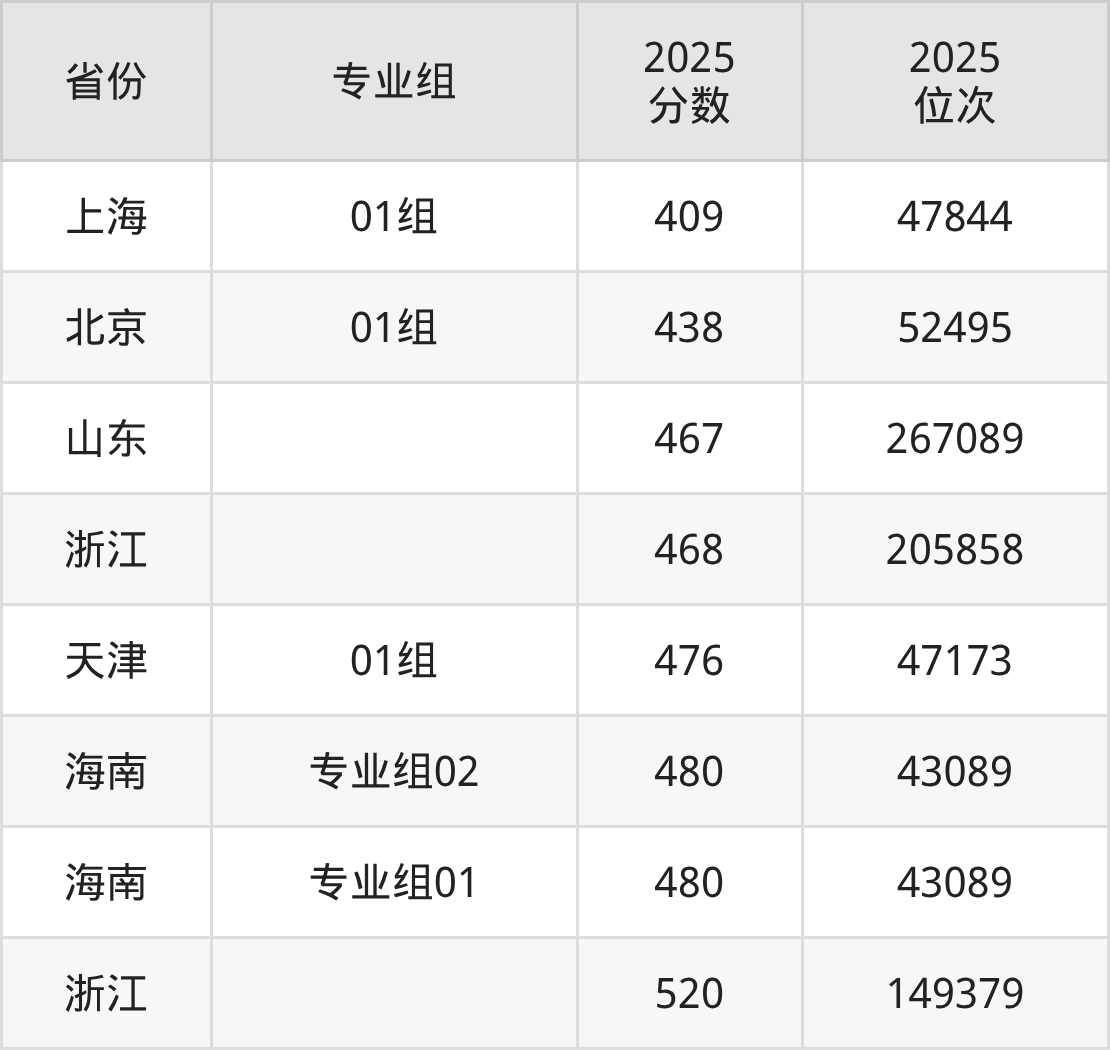 最低分对应地区为上海(01组),录取位次为47844,超本科线7分;最高分对应地区为浙江,录取位次为149379。