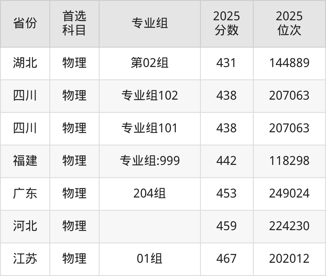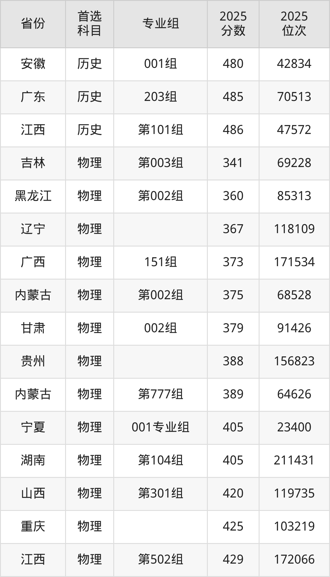 物理类最低分对应地区为吉林(第003组),录取位次为69228,超本科线1分;最高分对应地区为江苏(01组),录取位次为202012,超本科线4分。