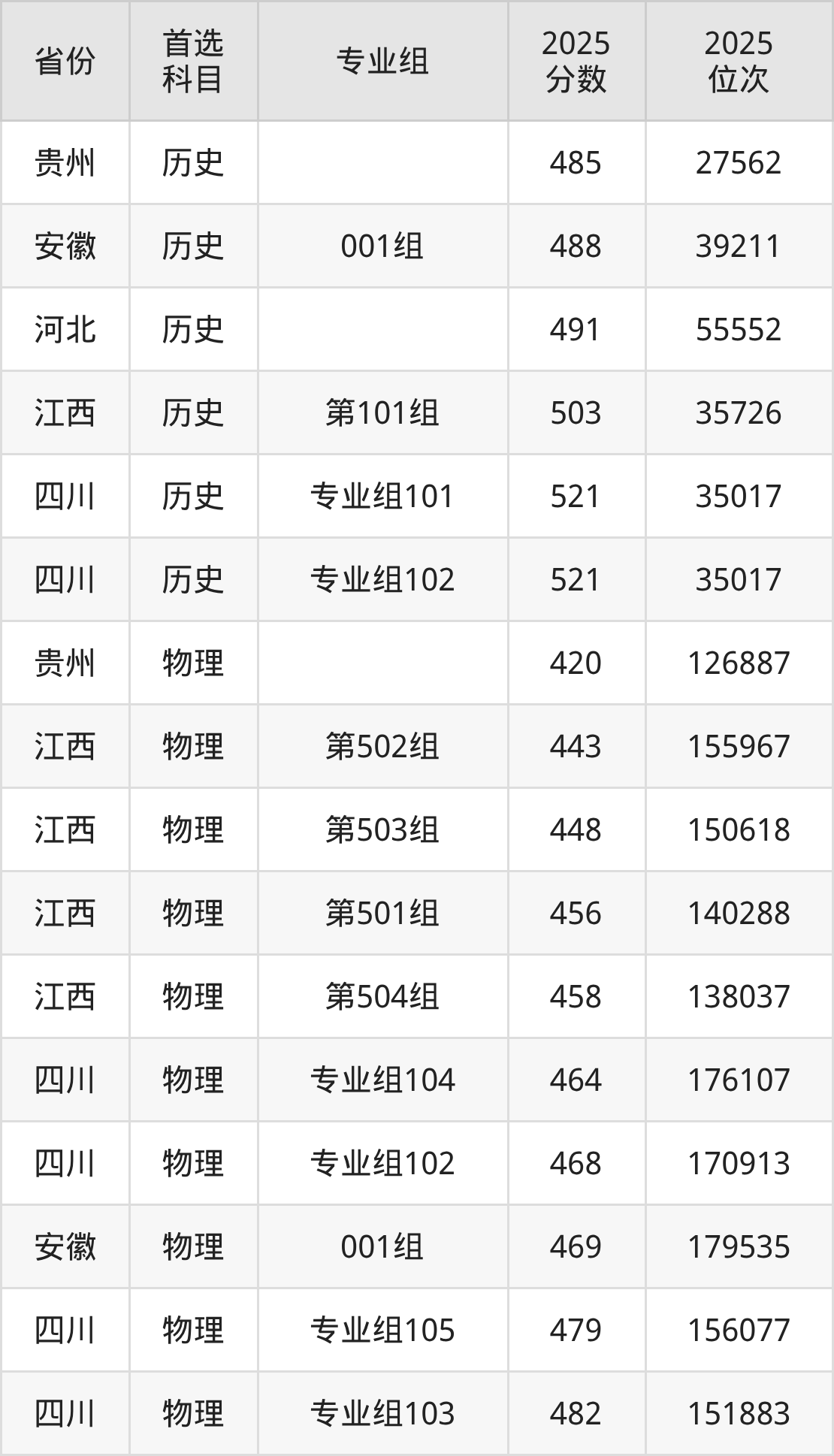 历史类最低分对应地区为贵州,录取位次为27562,超专科线305分;最高分对应地区为四川(专业组102),录取位次为35017,超专科线371分。