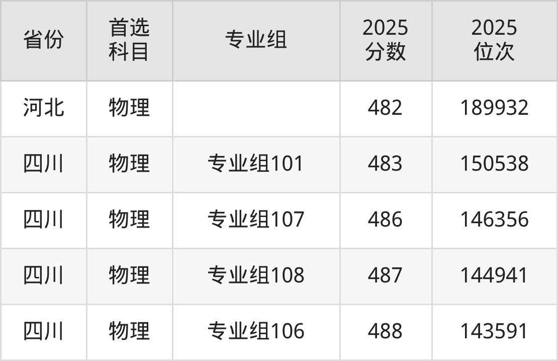 物理类最低分对应地区为贵州,录取位次为126887;最高分对应地区为四川(专业组106),录取位次为143591,超专科线338分。