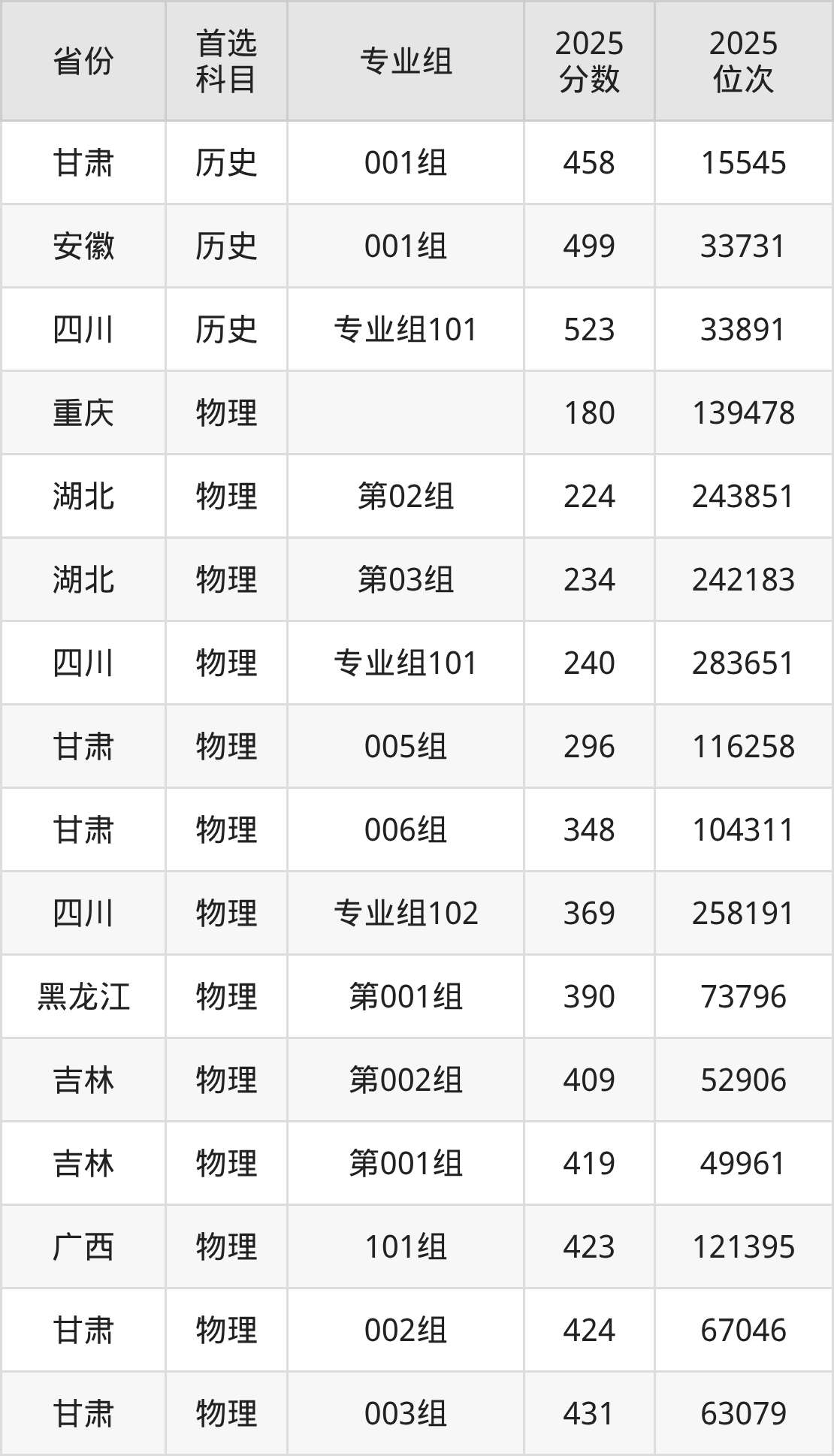 历史类最低分对应地区为甘肃(001组),录取位次为15545,超本科线46分;最高分对应地区为四川(专业组101),录取位次为33891,超本科B56分。