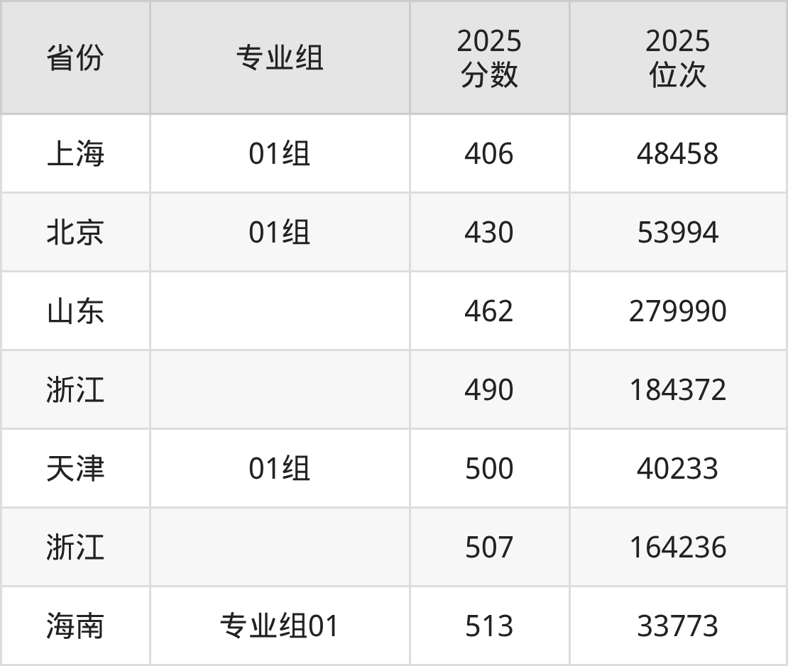 最低分对应地区为上海(01组),录取位次为48458,超本科线4分;最高分对应地区为海南(专业组01),录取位次为33773,超本科线33分。