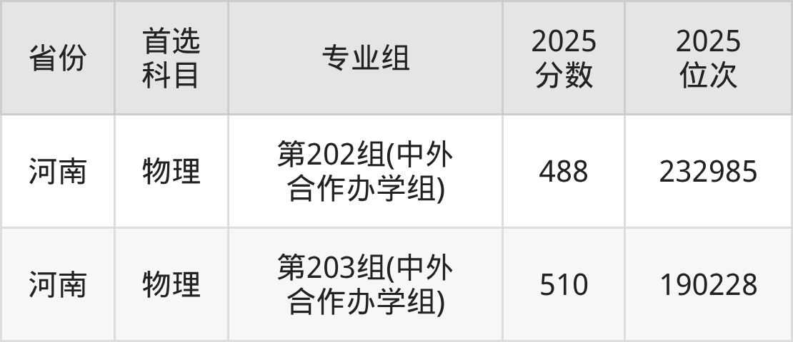 物理类最低分对应地区为河南(第202组(中外合作办学组)),录取位次为232985,超本科线61分;最高分对应地区为河南(第203组(中外合作办学组)),录取位次为190228,超本科线83分。