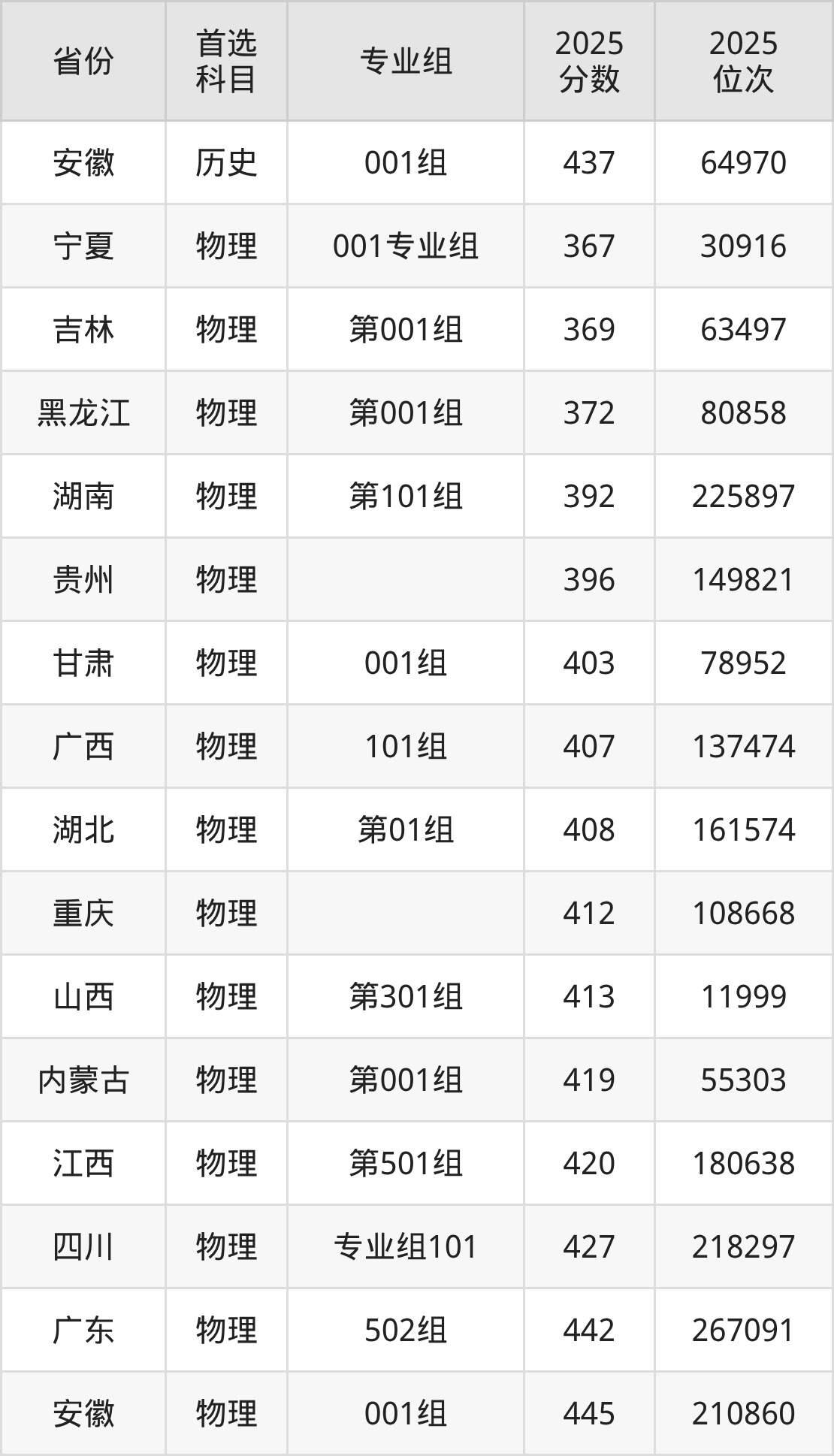 物理类最低分对应地区为宁夏(001专业组),录取位次为30916,超专科线217分;最高分对应地区为河北,录取位次为232534,超专科线253分。