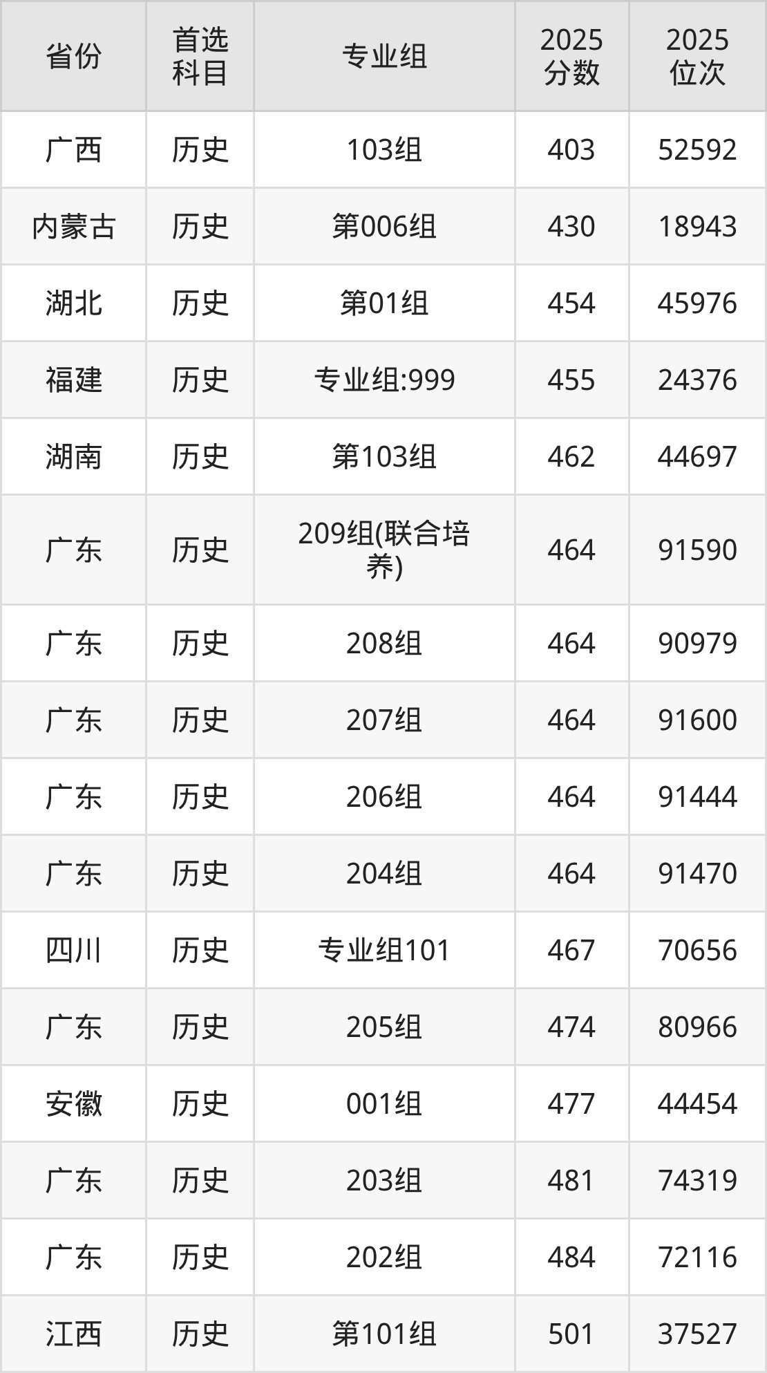 历史类最低分对应地区为广西(103组),录取位次为52592,超本科线1分;最高分对应地区为江西(第101组),录取位次为37527,超本科线15分。