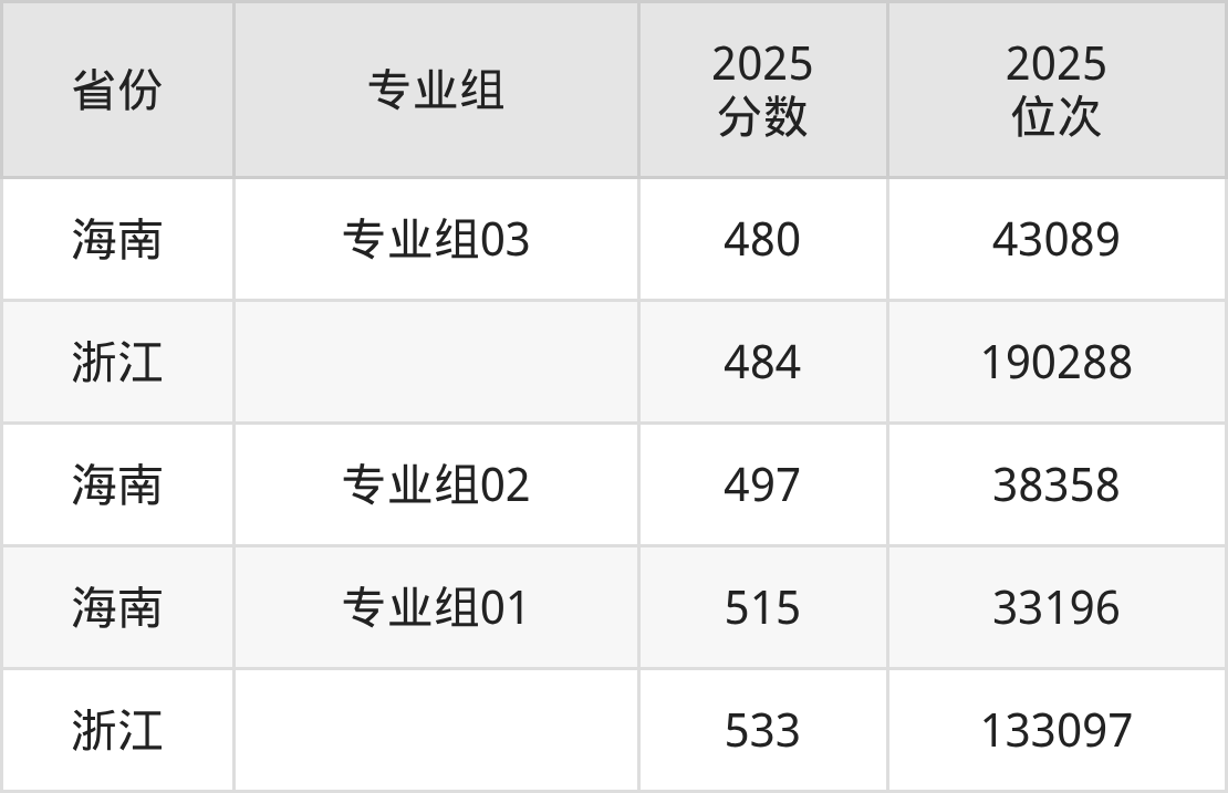 最低分对应地区为海南(专业组03),录取位次为43089;最高分对应地区为浙江,录取位次为133097,超一段线43分。