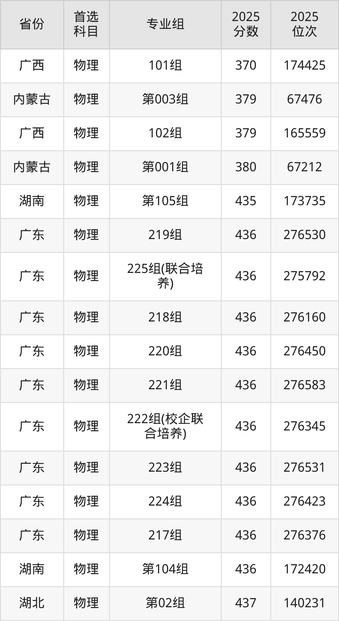 物理类最低分对应地区为广西(101组),录取位次为174425;最高分对应地区为安徽(001组),录取位次为175218,超本科线11分。