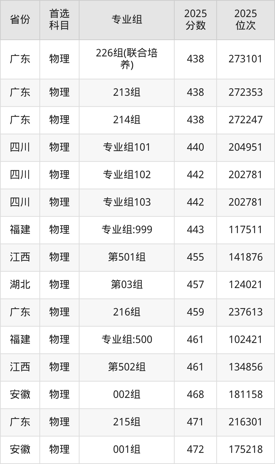 物理类:213组438分、272353名,214组438分、272247名,215组471分、216301名,216组459分、237613名,217组436分、276376名,218组436分、276160名,219组436分、276530名,220组436分、276450名,221组436分、276583名,222组(校企联合培养)436分、276345名,223组436分、276531名,224组436分、276423名,225组(联合培养)436分、275792名,226组(联合培养)438分、273101名;