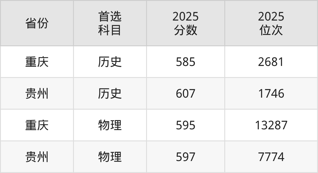 历史类最低分对应地区为重庆,录取位次为2681,超本科线147分;最高分对应地区为贵州,录取位次为1746,超本科线149分。