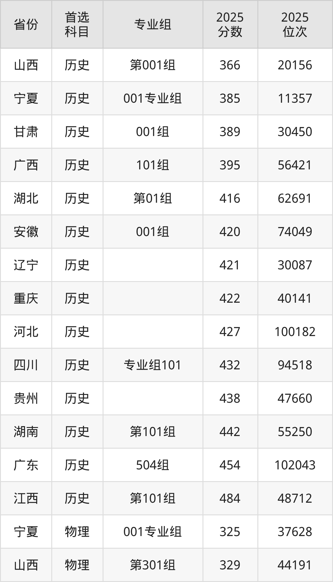 历史类最低分对应地区为山西(第001组),录取位次为20156,超专科线266分;最高分对应地区为江西(第101组),录取位次为48712,超专科线194分。