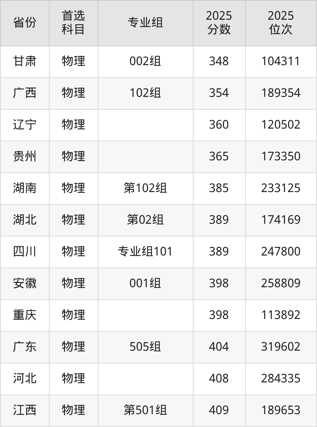 物理类最低分对应地区为宁夏(001专业组),录取位次为37628,超专科线175分;最高分对应地区为江西(第501组),录取位次为189653,超专科线169分。