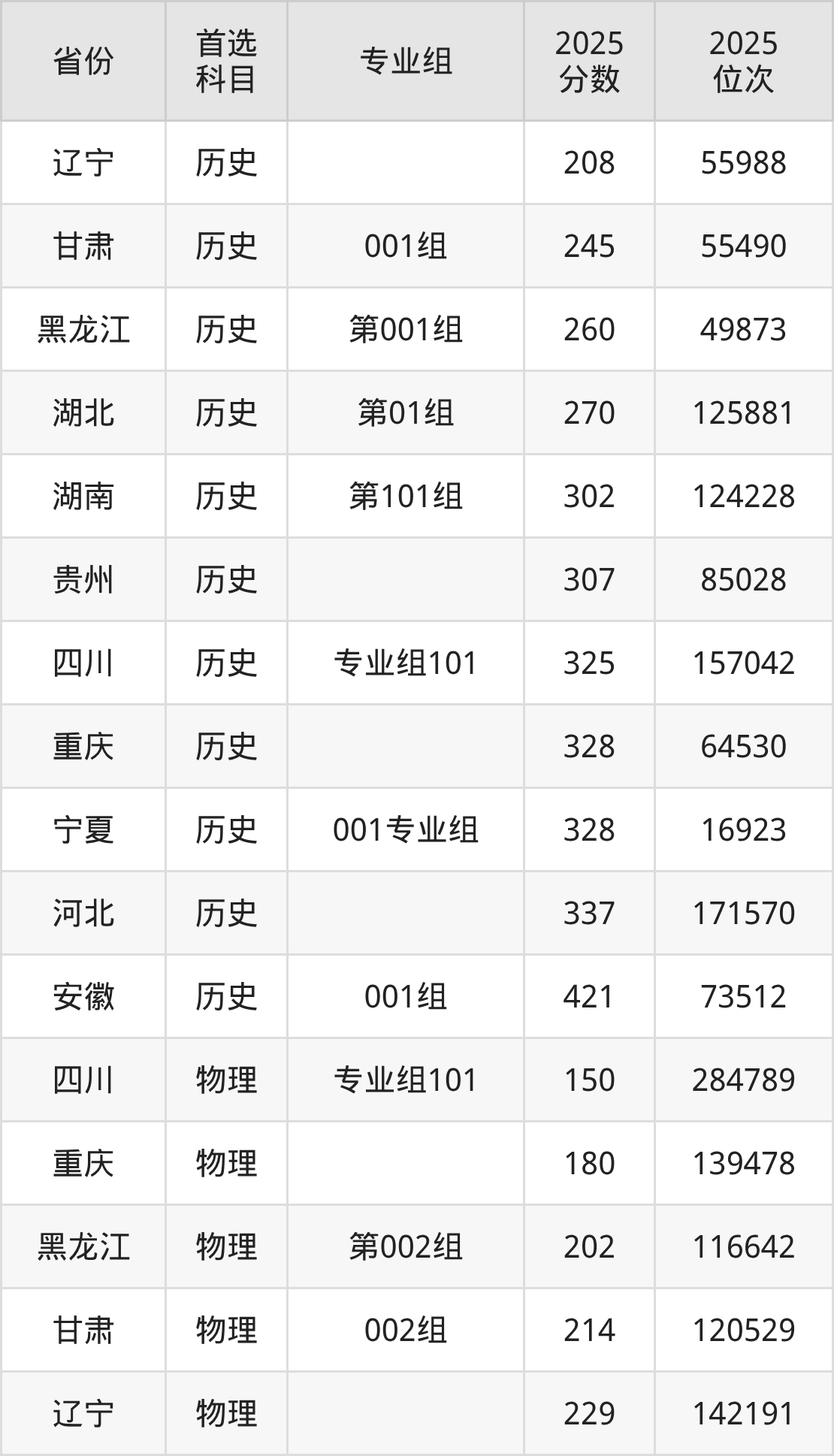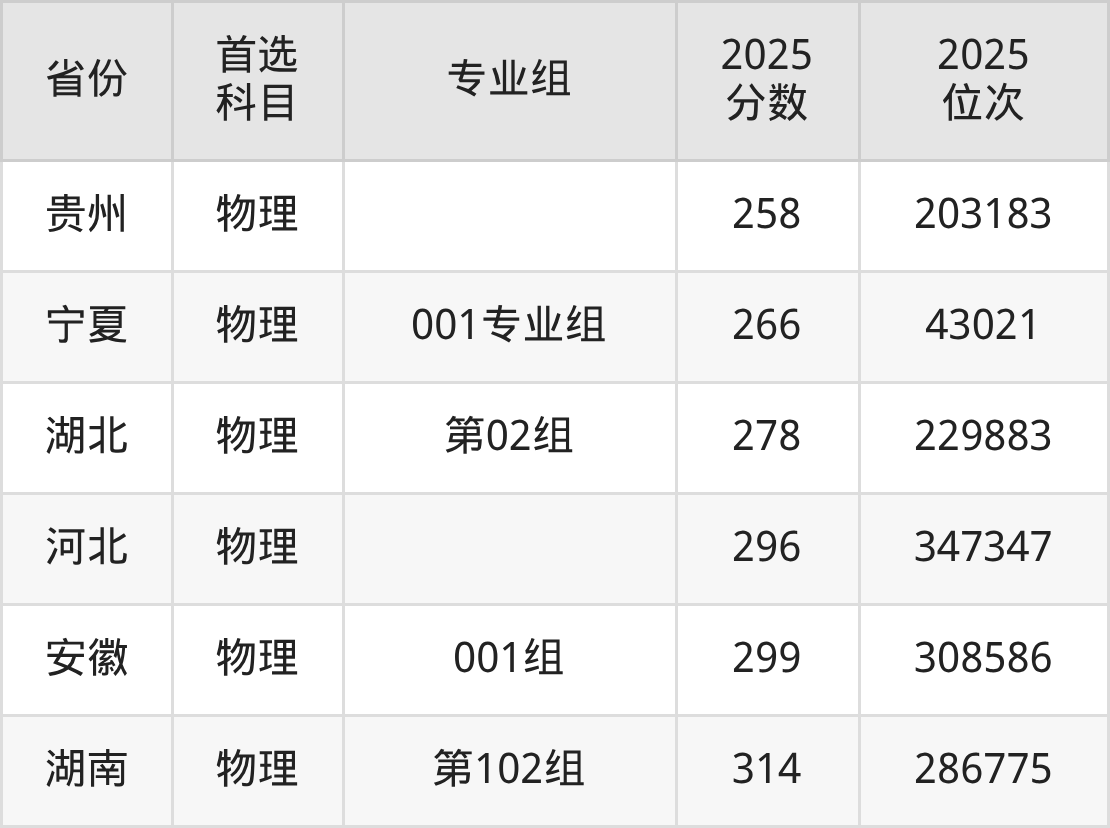 物理类最低分对应地区为四川(专业组101),录取位次为284789;最高分对应地区为湖南(第102组),录取位次为286775,超专科线114分。