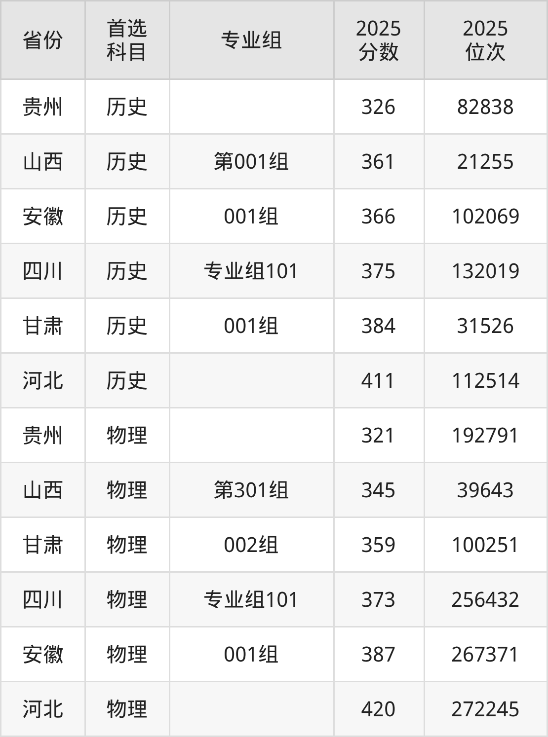 历史类最低分对应地区为贵州,录取位次为82838,超专科线146分;最高分对应地区为河北,录取位次为112514,超专科线211分。
