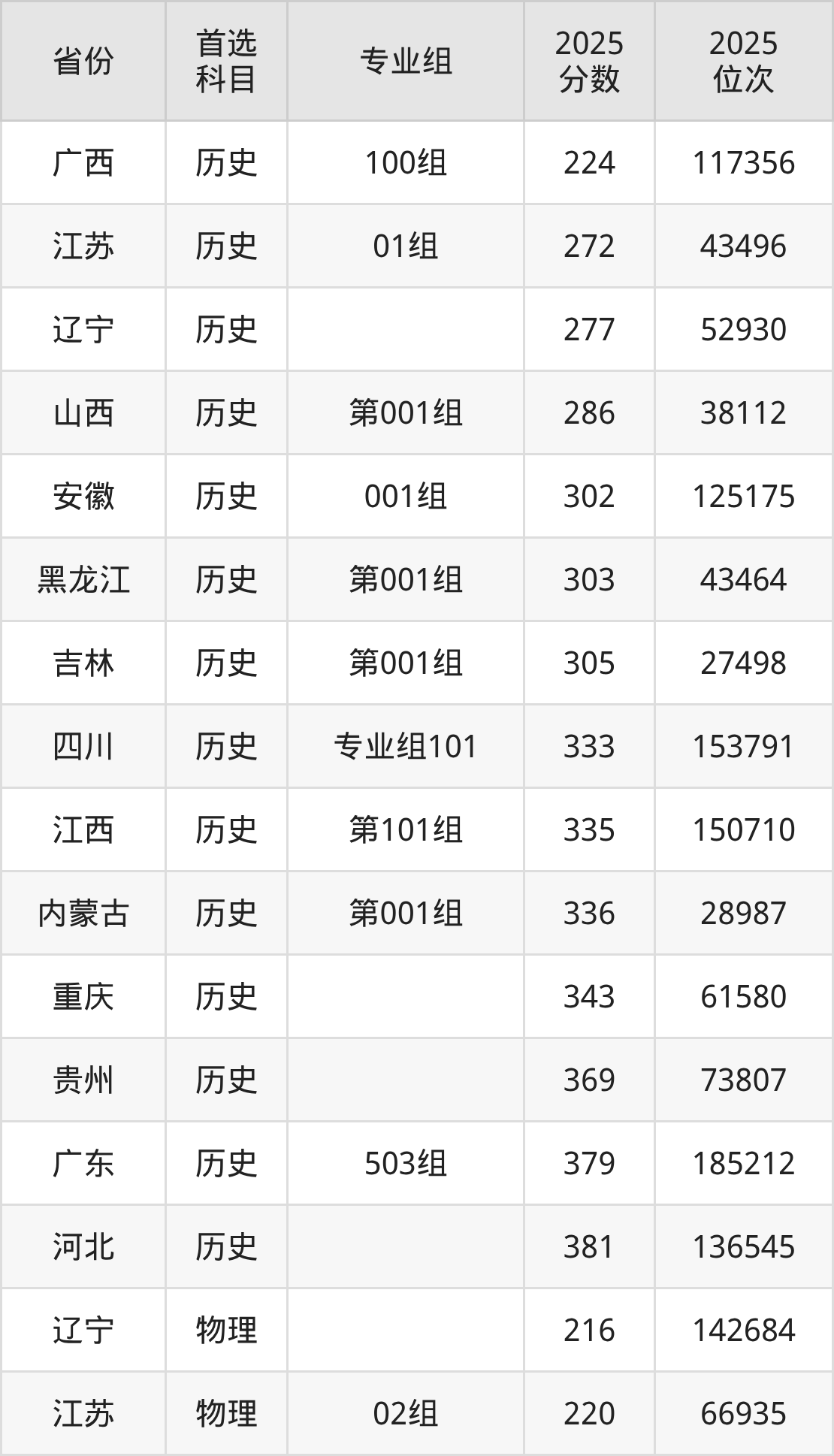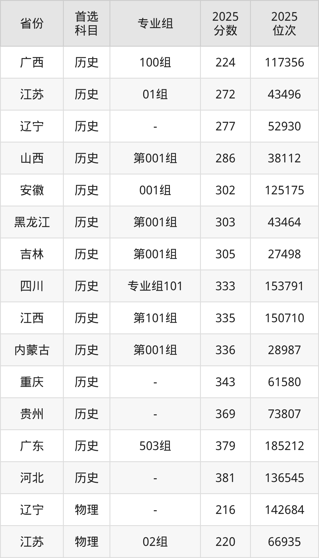 历史类最低分对应地区为广西(100组),录取位次为117356,超专科线24分;最高分对应地区为河北,录取位次为136545,超专科线181分。