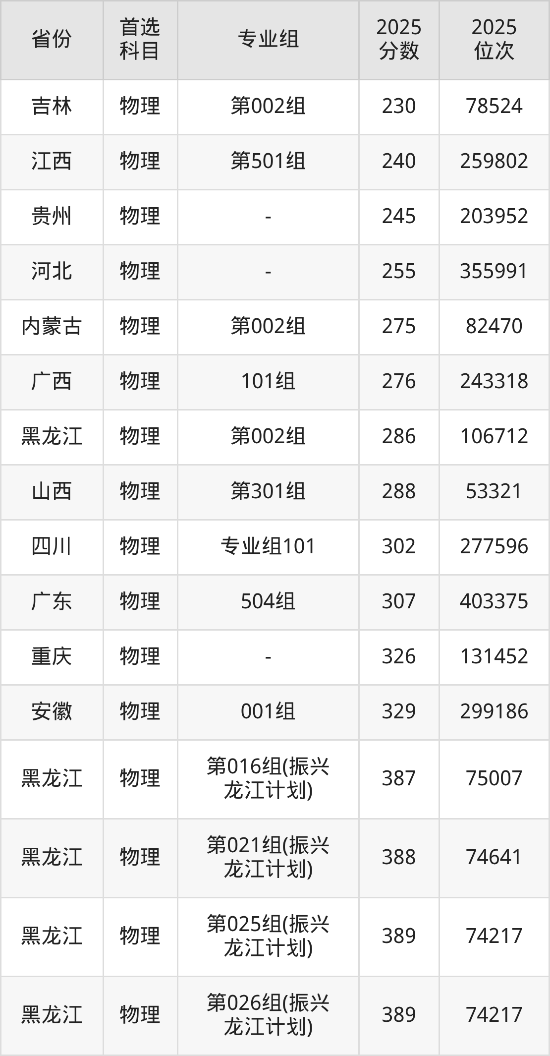 物理类最低分对应地区为辽宁,录取位次为142684,超专科线66分;最高分对应地区为黑龙江(第017组(振兴龙江计划)),录取位次为50020。