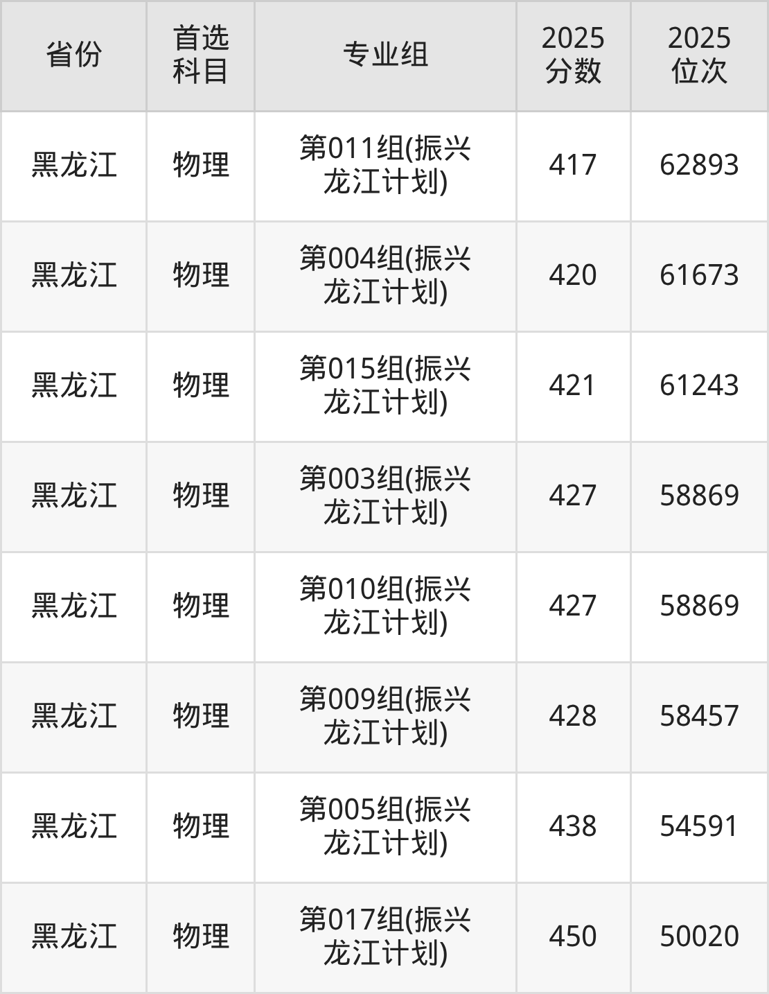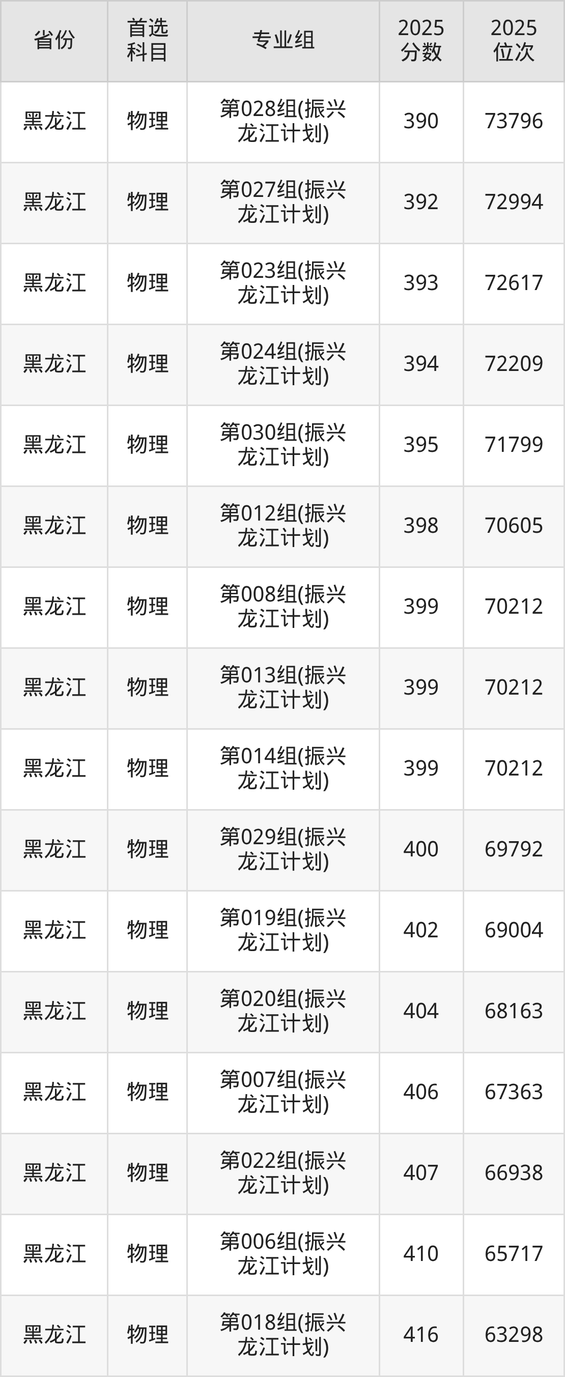 物理类:第005组236分、119232名,第006组291分、109530名,第007组(振兴龙江计划)413分、66015名,第008组(振兴龙江计划)410分、67141名,第009组(振兴龙江计划)407分、68294名,第010组(振兴龙江计划)406分、68630名,第011组(振兴龙江计划)404分、69413名,第012组(振兴龙江计划)402分、70215名,第013组(振兴龙江计划)402分、70215名;