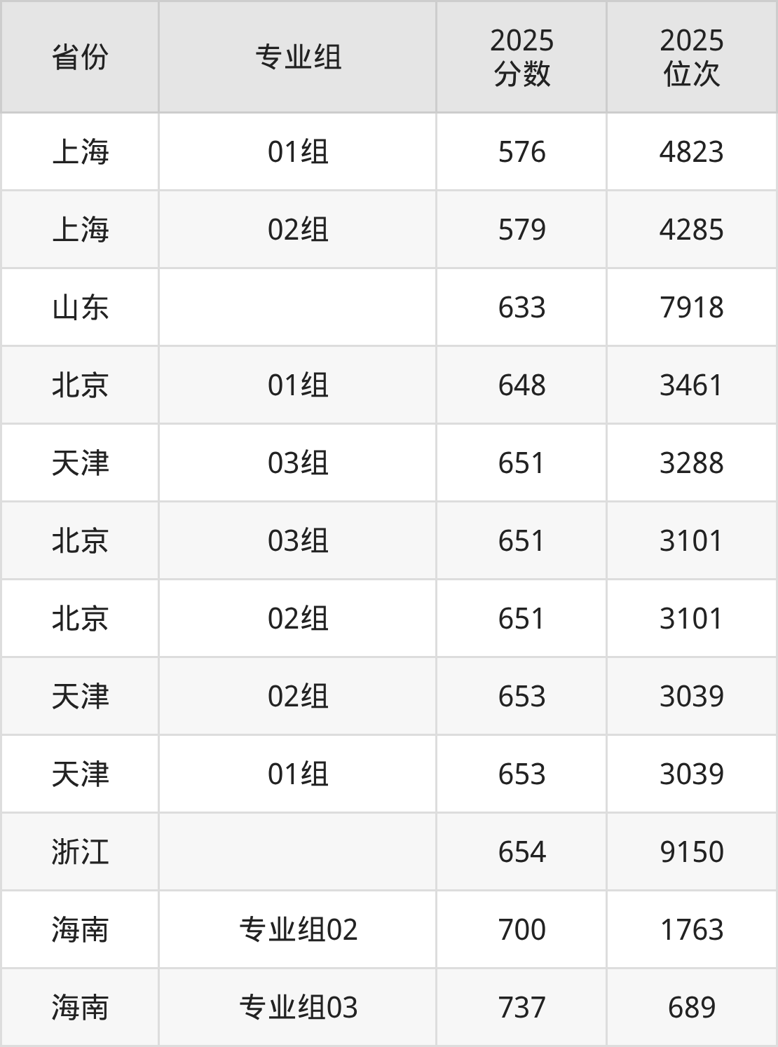 最低分对应地区为上海(01组),录取位次为4823,超本科线174分;最高分对应地区为海南(专业组03),录取位次为689,超本科线257分。
