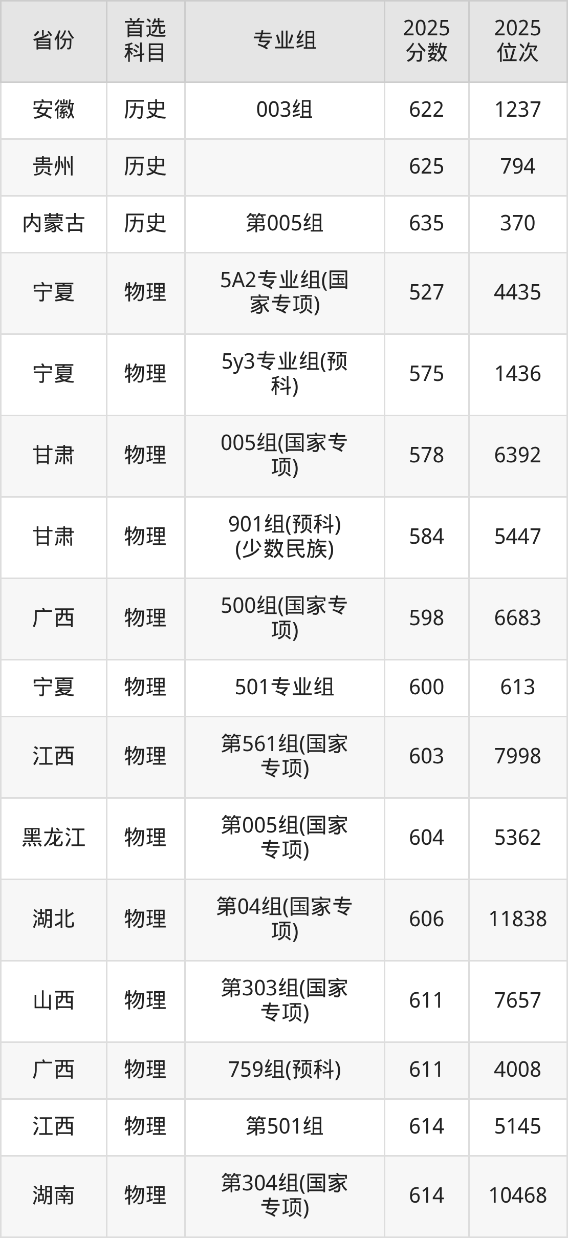 历史类最低分对应地区为广东(206组(中外合作)),录取位次为6775,超本科线129分;最高分对应地区为内蒙古(第005组),录取位次为370,超本科线217分。