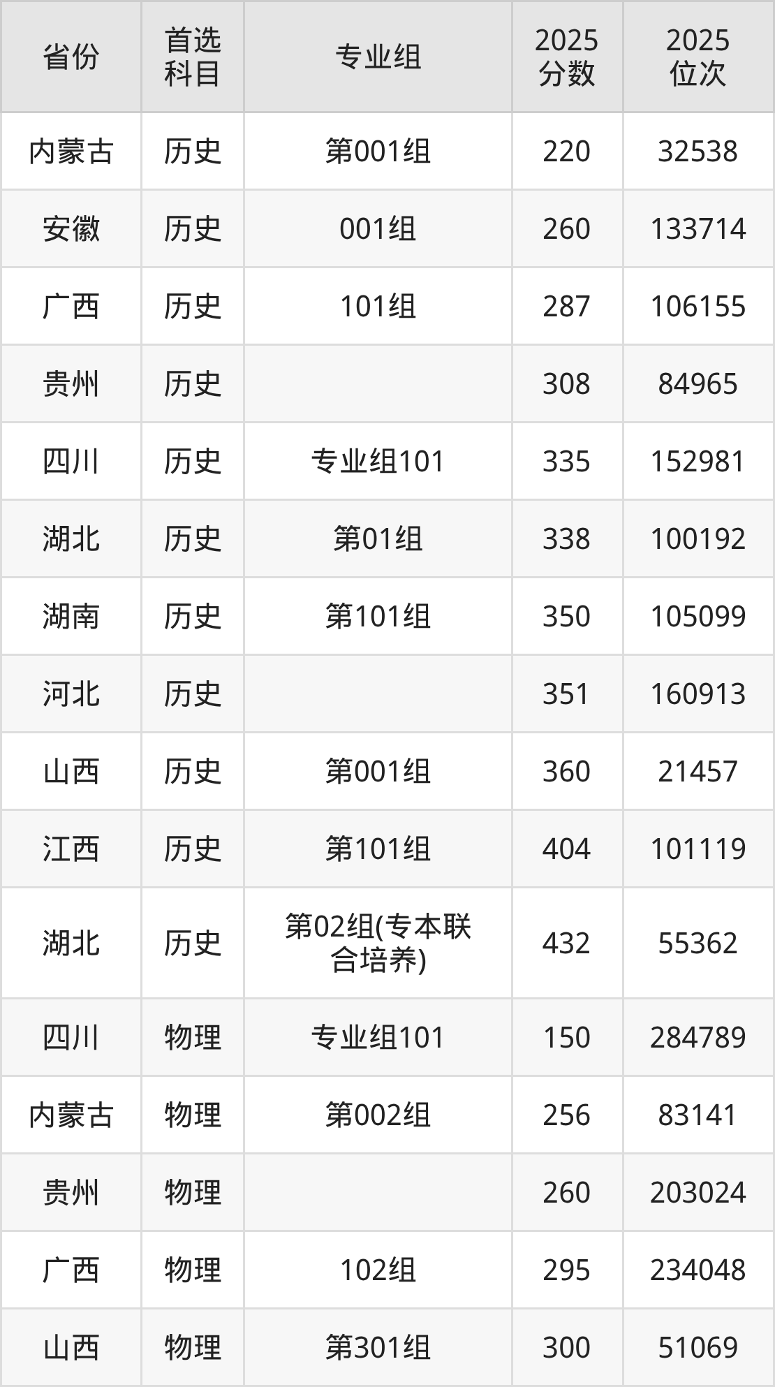 历史类:第01组338分、100192名,第02组(专本联合培养)432分、55362名;