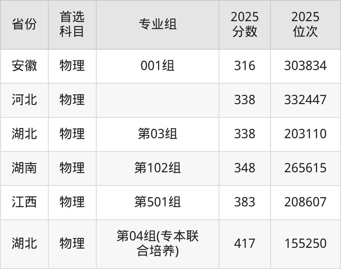 物理类最低分对应地区为四川(专业组101),录取位次为284789;最高分对应地区为湖北(第04组(专本联合培养)),录取位次为155250,超专科线217分。