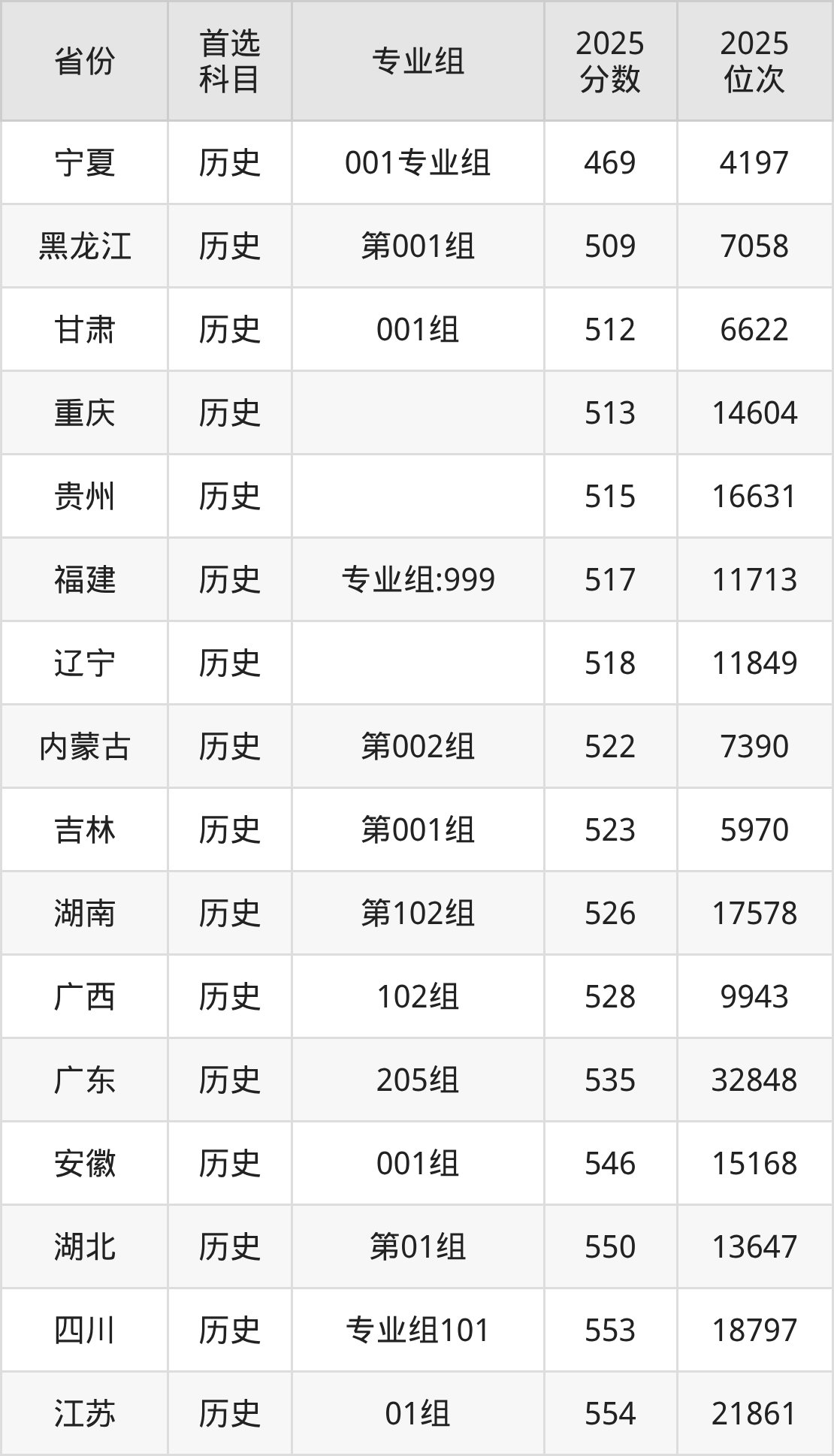 历史类最低分对应地区为宁夏(001专业组),录取位次为4197,超本科B65分;最高分对应地区为河北,录取位次为17998,超本科线84分。