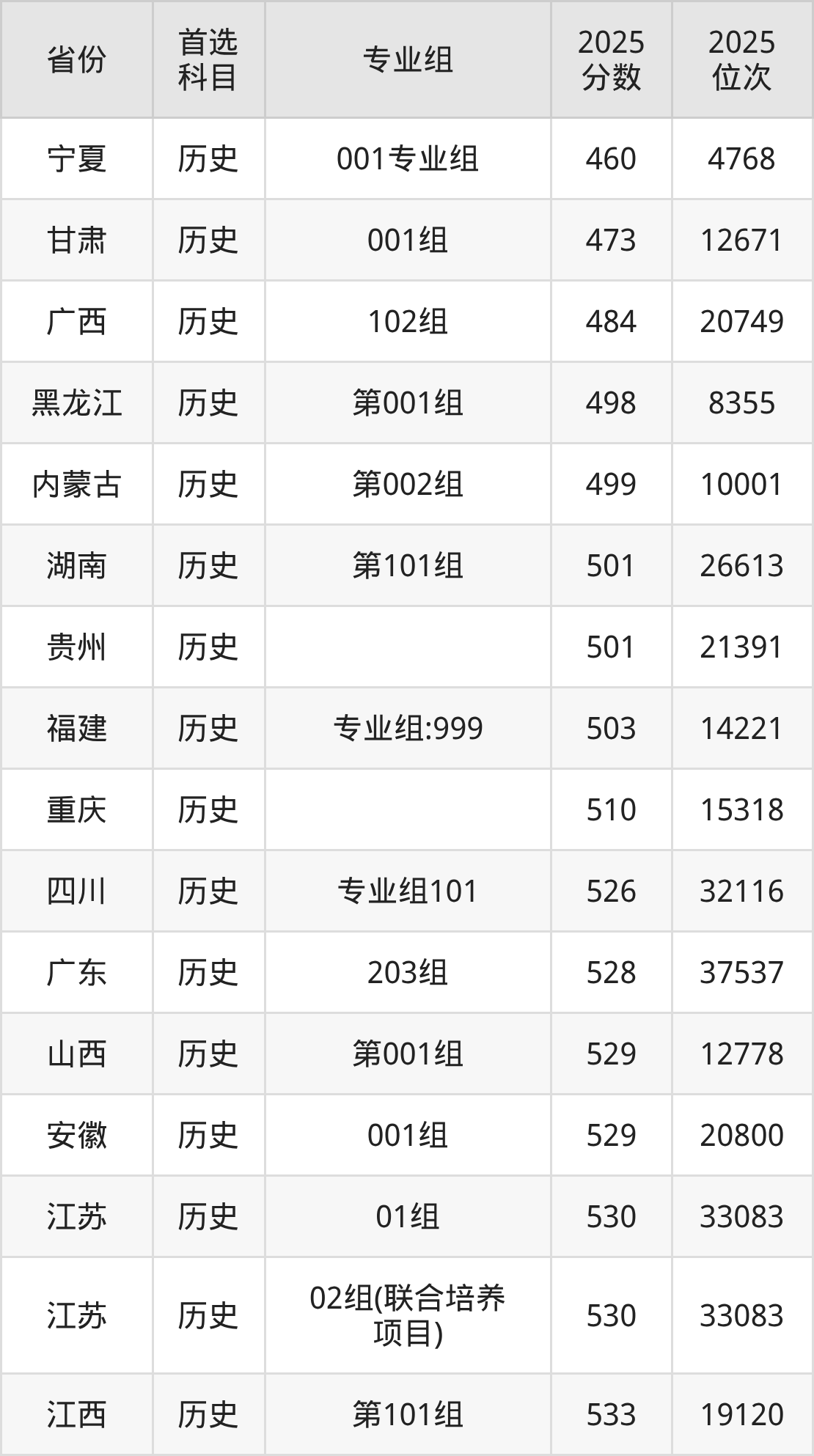 历史类:01组530分、33083名,02组(联合培养项目)530分、33083名;