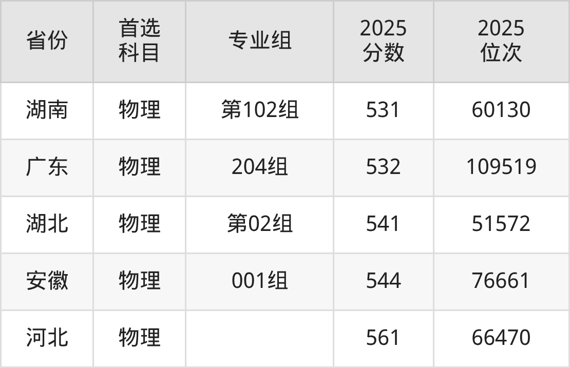 物理类最低分对应地区为贵州,录取位次为83223,超本科线77分;最高分对应地区为河北,录取位次为66470,超本科线102分。
