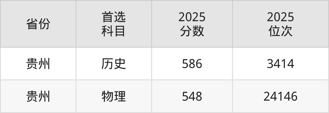 历史类最低分对应地区为贵州,录取位次为3414,超本科线138分。
