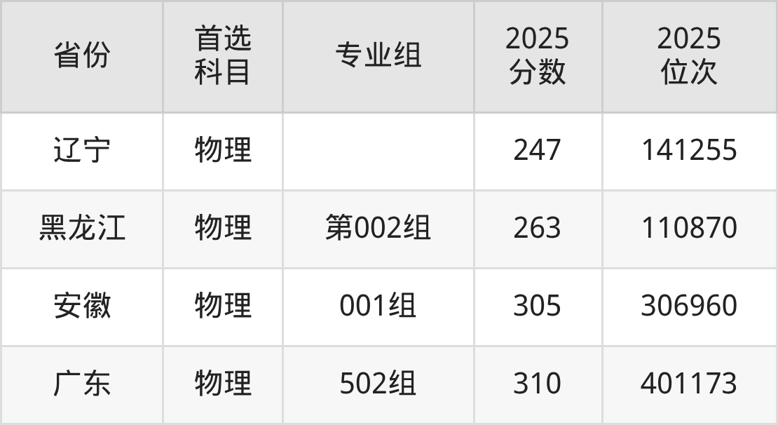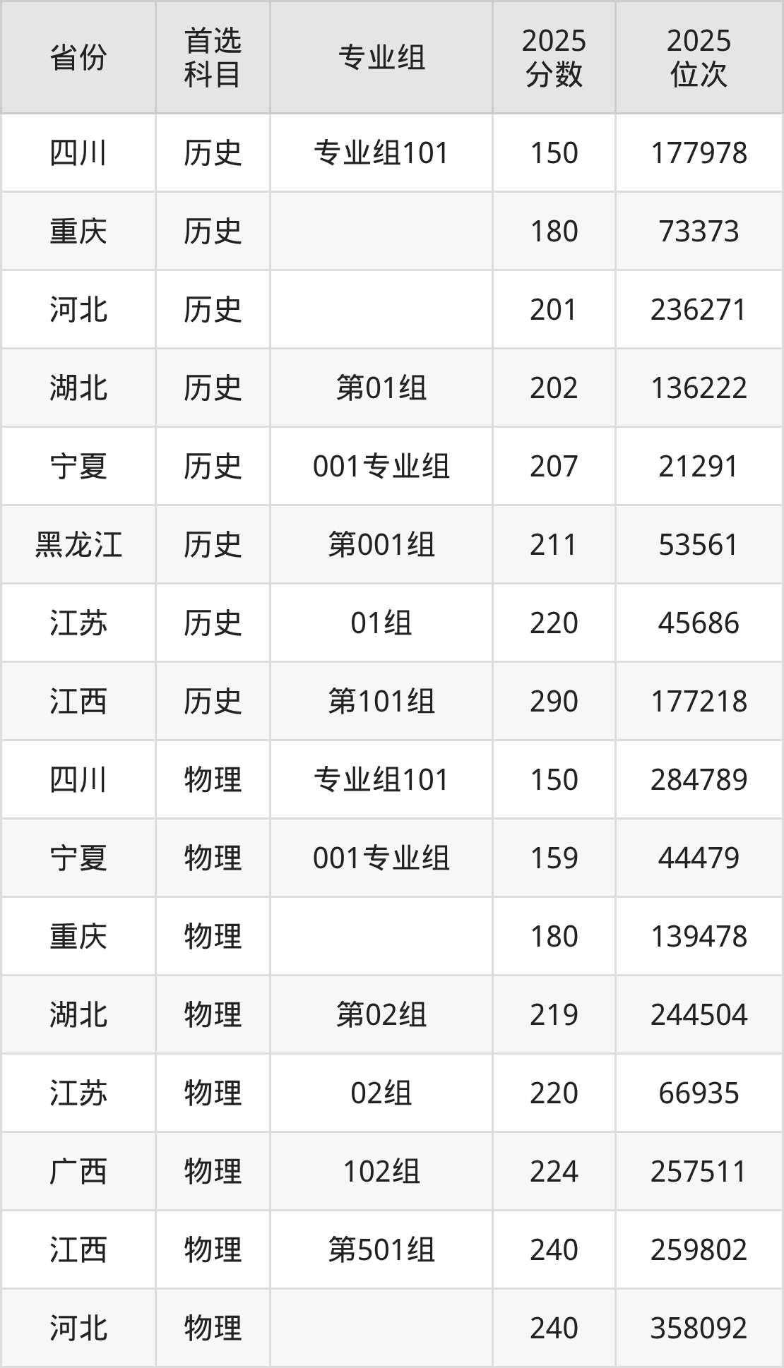 历史类最低分对应地区为四川(专业组101),录取位次为177978;最高分对应地区为江西(第101组),录取位次为177218。