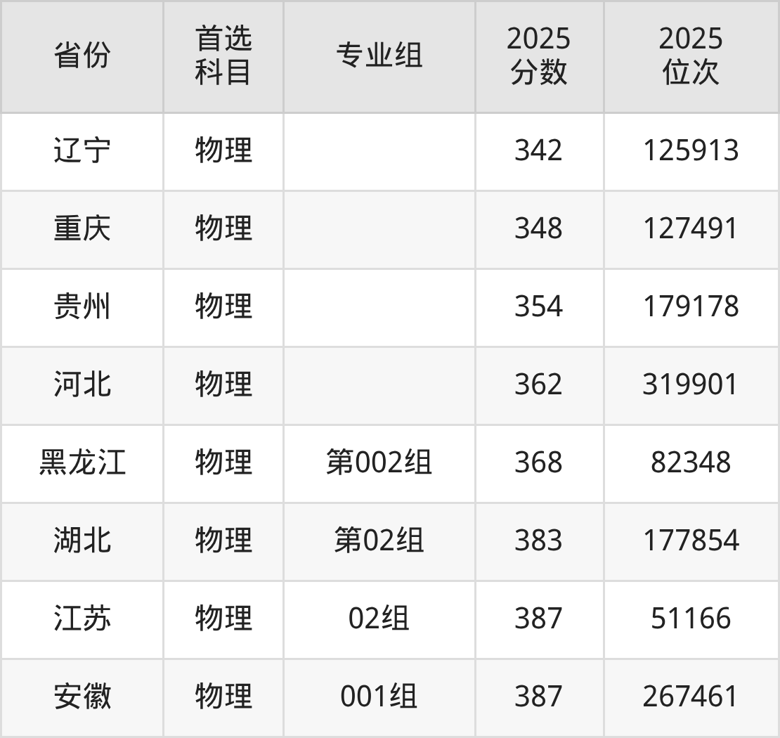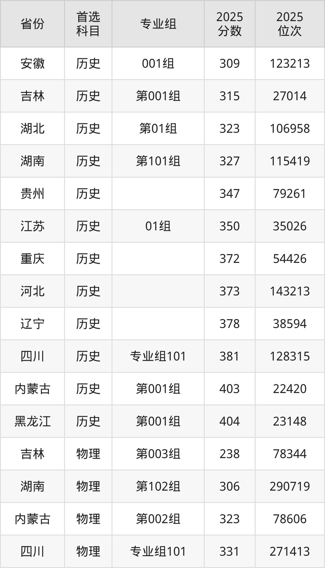 物理类最低分对应地区为吉林(第003组),录取位次为78344,超专科线78分;最高分对应地区为安徽(001组),录取位次为267461,超专科线187分。
